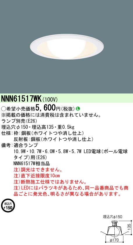 パナソニック NNN61517WK ダウンライト 天井埋込型 LED(電球色) φ150 ホワイト ランプ別売