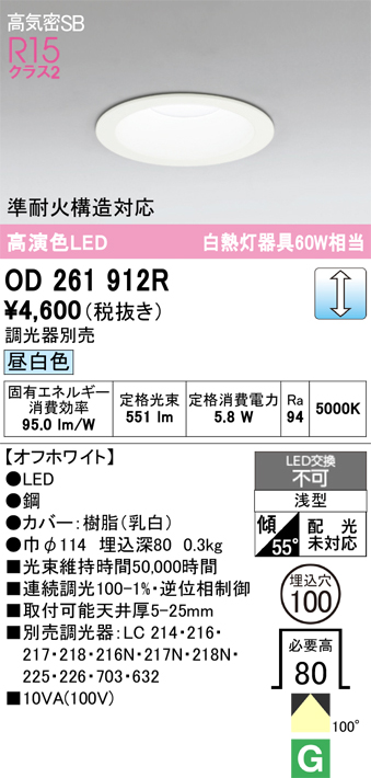 オーデリック OD261912R ダウンライト LED一体型 調光 調光器別売 昼白色 高気密SB 埋込穴φ100 オフホワイト