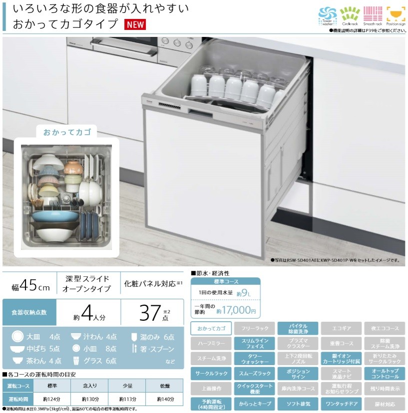 食器洗い乾燥機 リンナイ RSW-D401AE-B 幅45cm 深型スライドオープン おかってカゴタイプ スタンダード ブラック