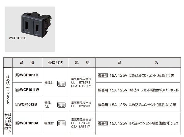 電設資材 パナソニック WCF1011B(発注単位:50) 黒 機器用 はめ込みコンセント 極性付 15A 125V ※受注生産品
