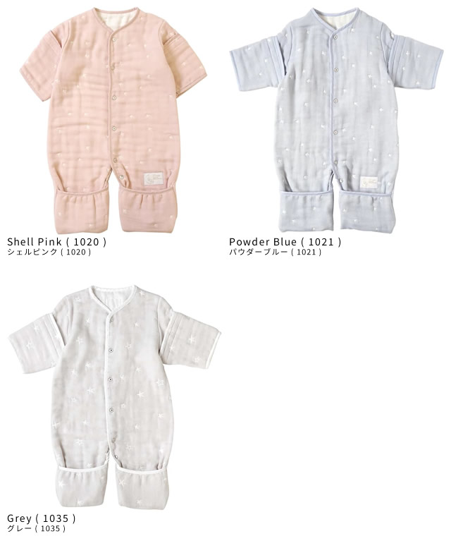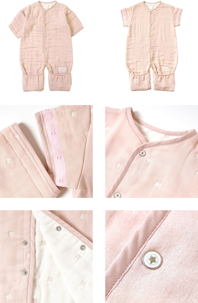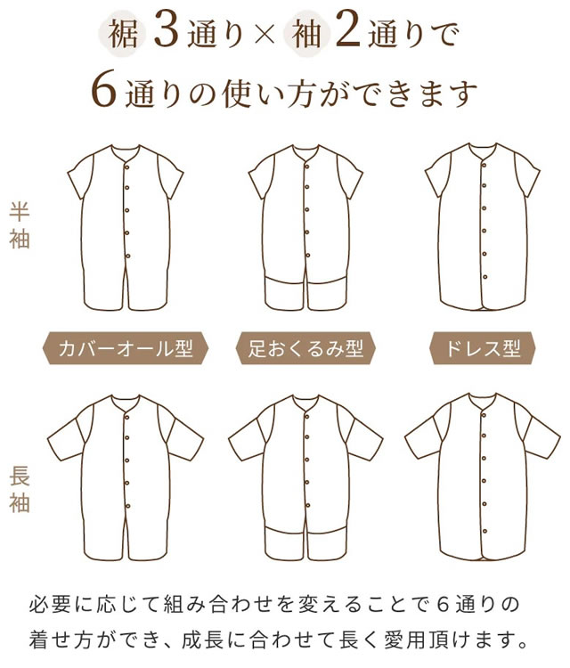 | 仕様 | ・6way仕様スリーパー ・6重ガーゼ仕様 ・スナップボタン留具 ・長袖取外可能(スナップ留具) ※足おくるみ(3ヶ月〜1歳頃) ※カバーオール式(3ヶ月〜2歳頃) ※ドレス式(3ヶ月〜7歳頃) |
