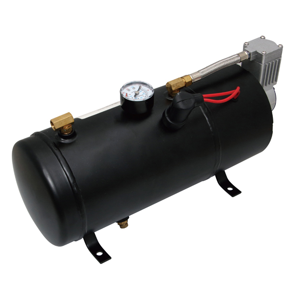 自動でエアーを充填し、規定圧力で自動停止したあと、圧力が落ちると再び自動でエアーを充填するコンプレッサー付きのエアータンク「ホーンメイト」。