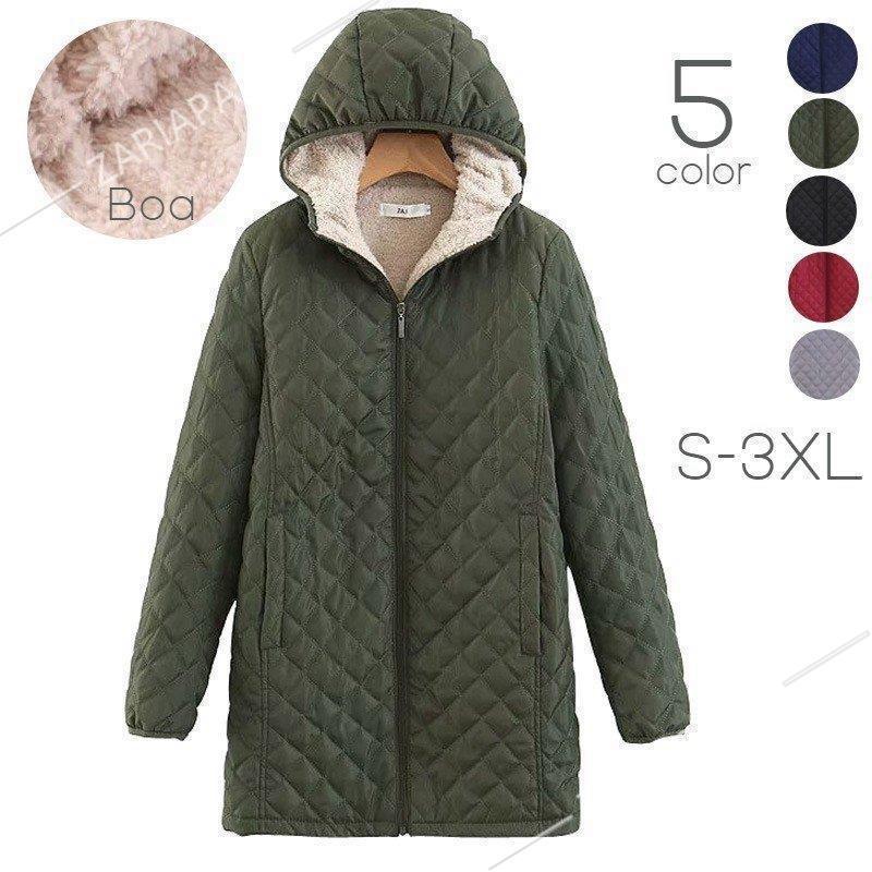キルティングジャケット レディース アウター 中綿入り コート ロングジャケット ジップアップ フード付き 内ボア 裏ボア 大きいサイズ あったか 防