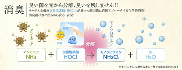 ■ 強力な消臭効果を発揮します。次亜塩素酸ナトリウムの数十倍の消臭効果がありますので、除菌と同時に悪臭も消滅します。