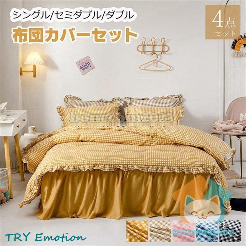 布団カバー シングル 3、4点セット フリル付き チェック柄春夏秋冬 布団セット 掛け布団カバー 寝具カバーセット セミダブル 枕カバー 敷布団カバー