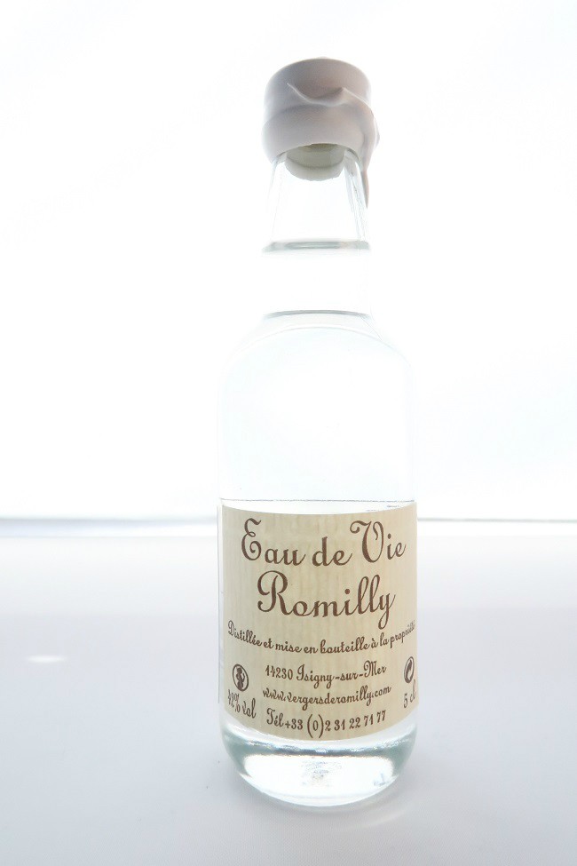カルヴァドス原酒 50mlのミニチュアボトルです。ロミリー果樹園で蒸留したカルヴァドスで、蒸留後樽で熟成させる前の蒸留所で味わえる製品です。