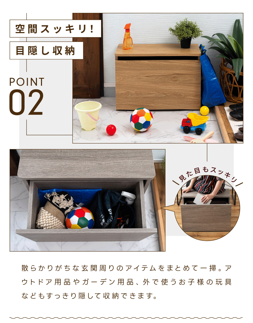 座れて収納もできる、省スペースな収納スツールで快適な玄関に。