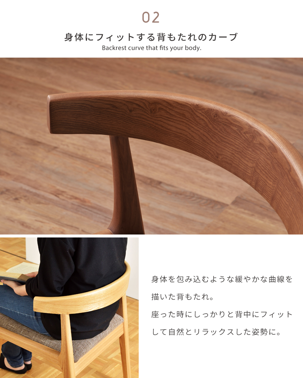背もたれには身体を包み込むような緩やかなカーブがかかっており座った時にしっかりと背中にフィットしてくれます。