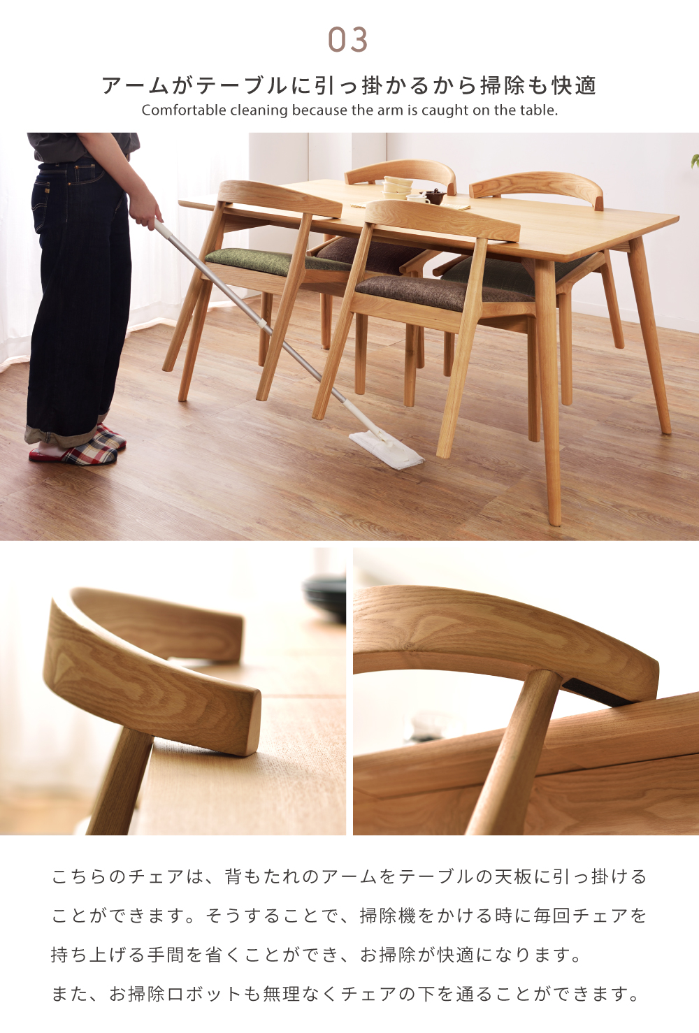 肘掛け裏や脚裏には傷防止フェルトが付いており、テーブルに引っ掛ける時やチェアを引くときにテーブルや床を傷つけにくいように配慮されています。