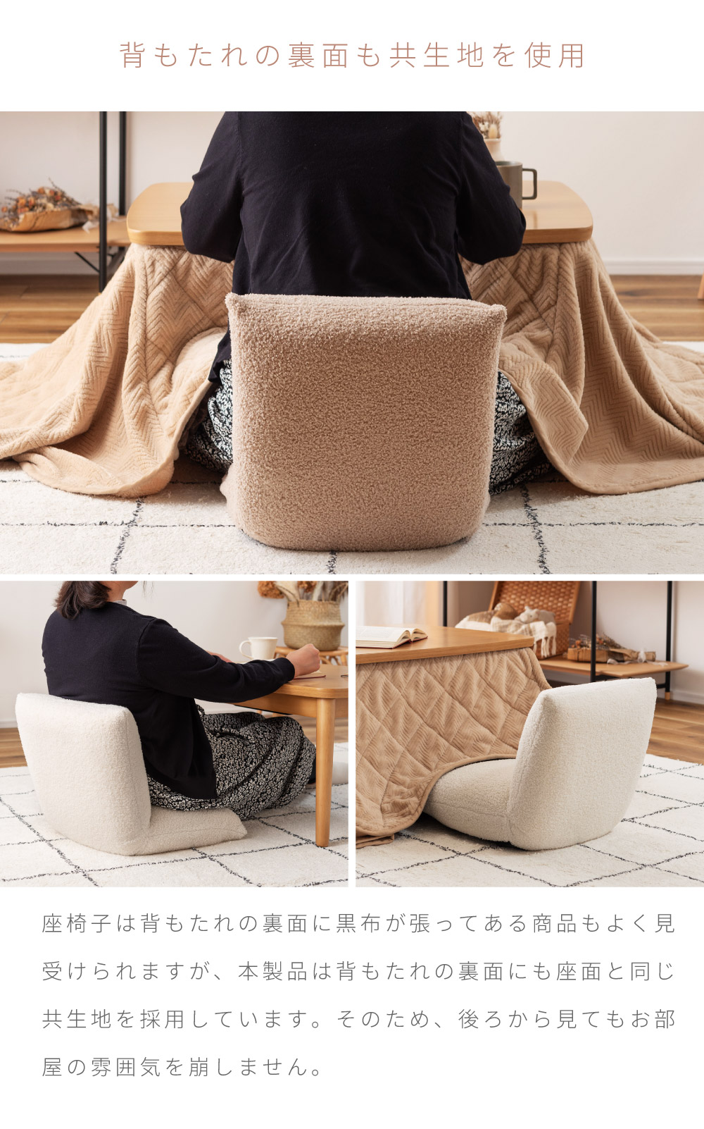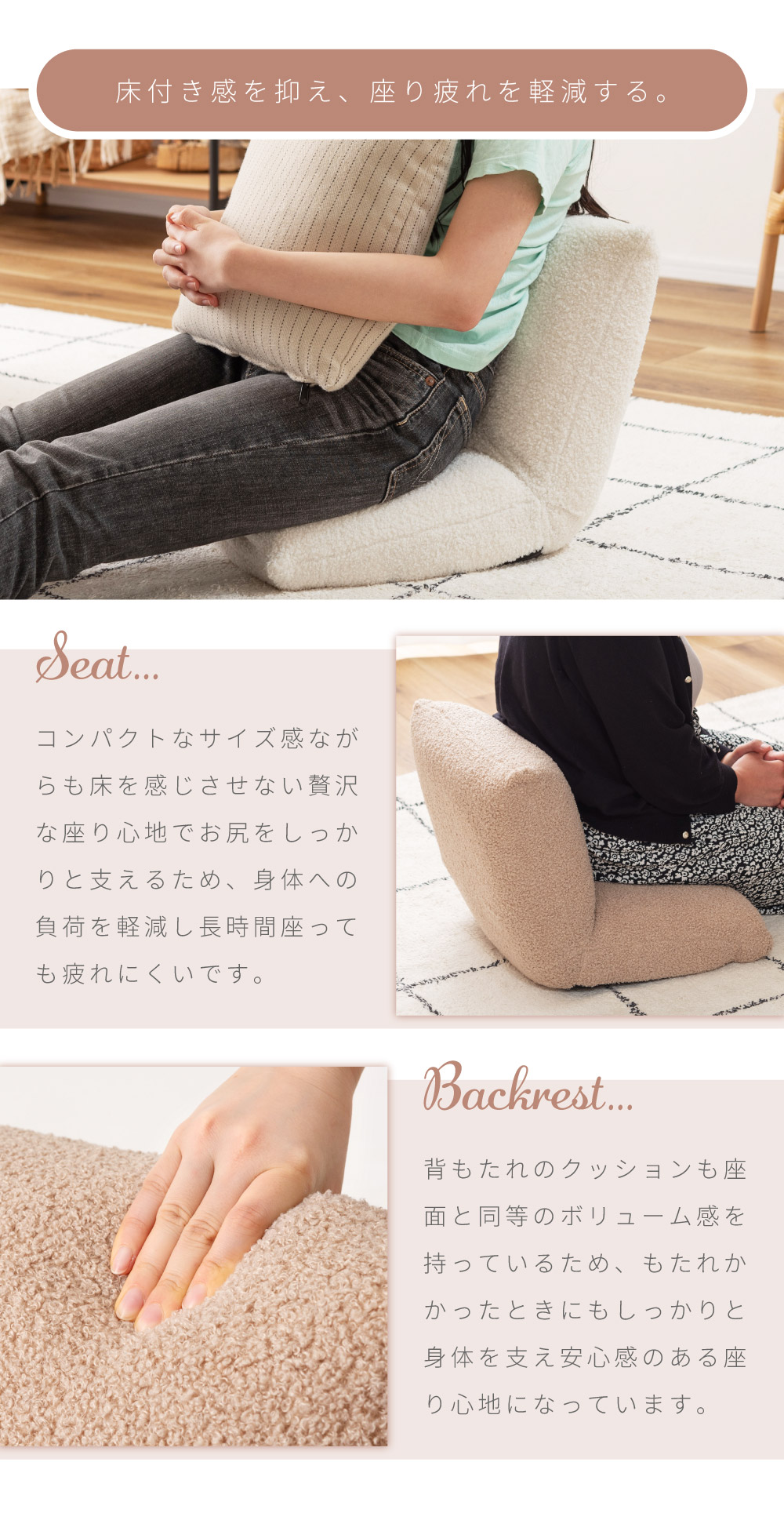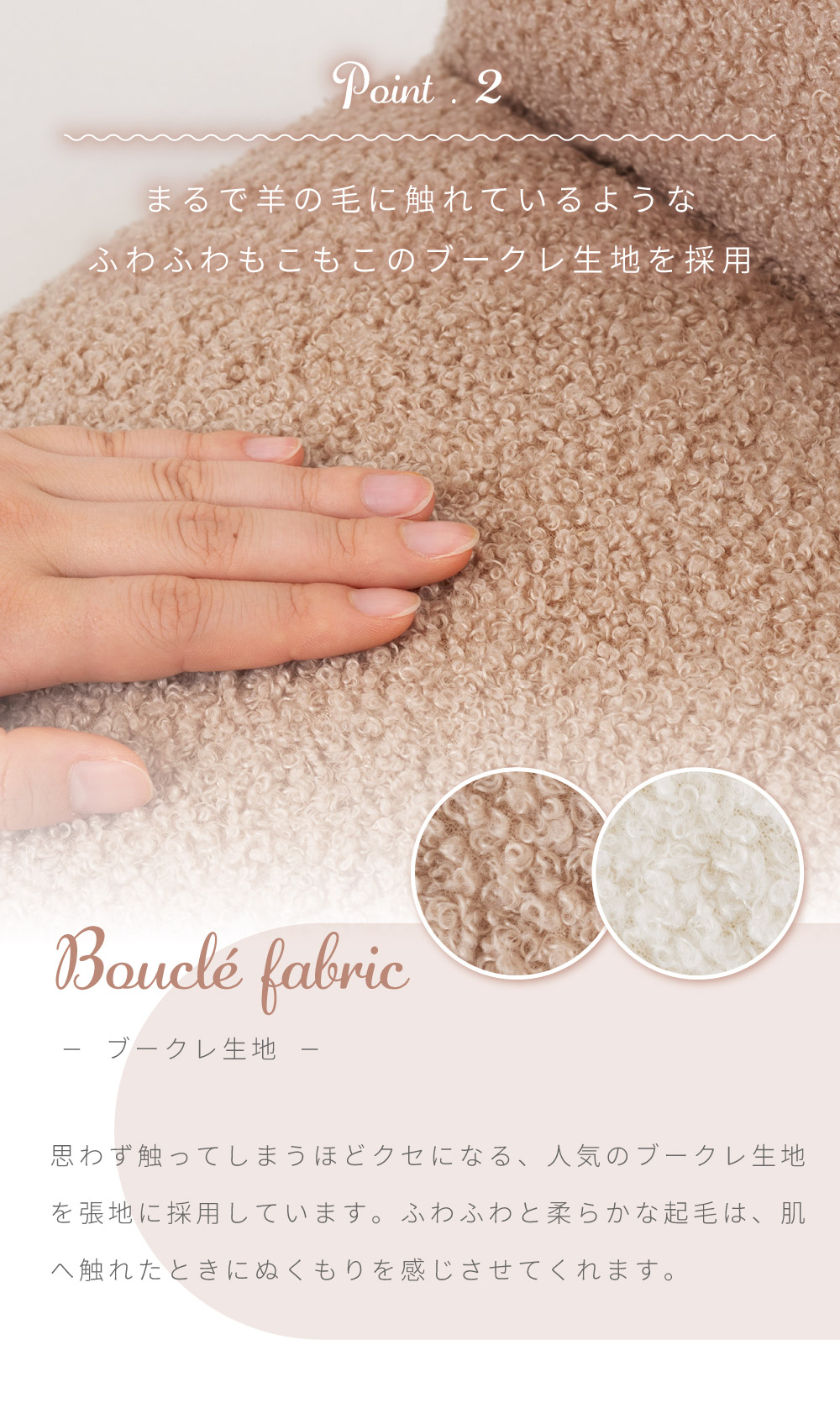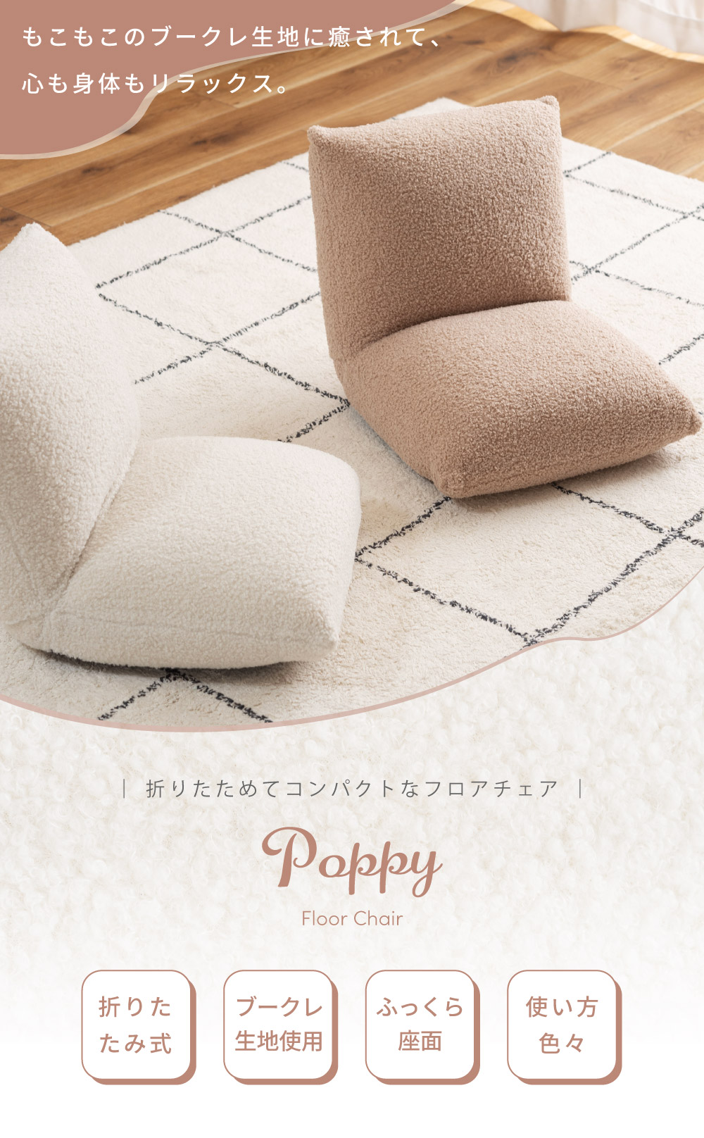 | ポイント | ●流行りの韓国インテリアと相性が良すぎるブークレ生地のフロアチェアができました。 ●ボリューム感たっぷりの座面と背もたれでしっかり身体をサポート たっぷりと中材を詰め込むことでしっかりとしたクッション性になり、ボリューム感のある座り心地を得ることができます。 ●床付き感を抑え、座り疲れを軽減する。 コンパクトなサイズ感ながらも床を感じさせない贅沢な座り心地でお尻をしっかりと支えるため、身体への負荷を軽減し長時間座っても疲れにくいです。 背もたれのクッションも座面と同等のボリューム感を持っているため、もたれかかったときにもしっかりと身体を支え安心感のある座り心地になっています。 ●まるで羊の毛に触れているようなふわふわもこもこのブークレ生地を採用 思わず触ってしまうほどクセになる、人気のブークレ生地を張地に採用しています。 ふわふわと柔らかな起毛は、肌へ触れたときにぬくもりを感じさせてくれます。 ●ブークレ生地とは 表面に糸の輪っか(ブークレ)が出るように加工された生地のことです。 フランス語で「輪」を意味する「bouclé (ブークレ)」に由来してそのように呼ばれています。 ●ブークレ生地の特徴 ・保温性に優れている ・柔らかい起毛で手触りが良い ・フェミニンで愛らしい印象を与える ●背もたれの裏面も共生地を使用 座椅子は背もたれの裏面に黒布が張ってある商品もよく見受けられますが、本製品は背もたれの裏面にも座面と同じ共生地を採用しています。 そのため、後ろから見てもお部屋の雰囲気を崩しません。 ●さまざまなシーンで大活躍、使い方次第でもっと自由な過ごし方を 読書をしたりテレビを見たり・・・、過ごし方は人それぞれ違うからこそ、自分が一番リラックスできる使い方で自由な時間を楽しみましょう。 ●ローテーブルと合わせて 座面が厚いため座り疲れしにくく、リモートワークなどの作業にも向いています。 お子様用のテーブルや一人暮らし用の小さめなテーブルとも合わせやすいです。 ●こたつと合わせて 座面が小さいからこそこたつ内部まで座面が侵入せず、こたつ内部が広々した空間に。 コンパクトなサイズだからこそ、布団との隙間ができにくく保温力を高めます。 ●まくらとして 肌触りの良いブークレ生地だからこそ、お昼寝用まくらとしてもお使いいただけます。 折りたたんで使うことで、ゲームや読書などのリラックスタイムのお供に最適です。 ●コンパクトな折りたたみ式で収納スペースも最小限に 背もたれをパタンと倒せる折りたたみ式になっており、使わないときには場所を取らないコンパクトなサイズになるため保管時も邪魔になりません。 ●背もたれを倒すだけで簡単コンパクト 折りたたみ方法は簡単で、背もたれを思い切り押すことで簡単にたためる仕様となっています。 また、戻す場合は背もたれを押し広げていただければ座椅子の形に戻ります。 ●軽量だから持ち運びもらくらく 商品の重さは約2kgととても軽量で、簡単に持ち運ぶことができます。 |
