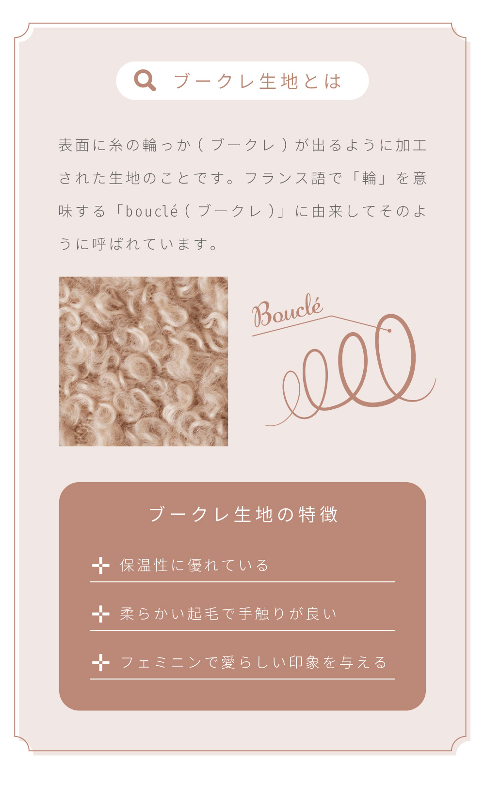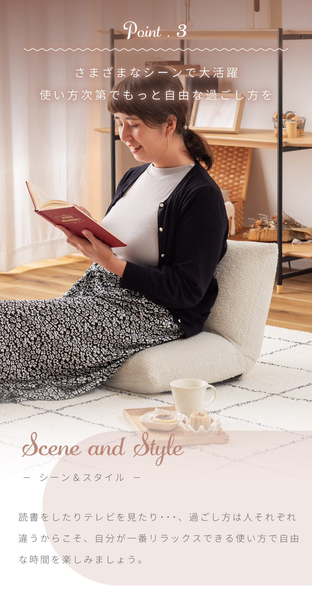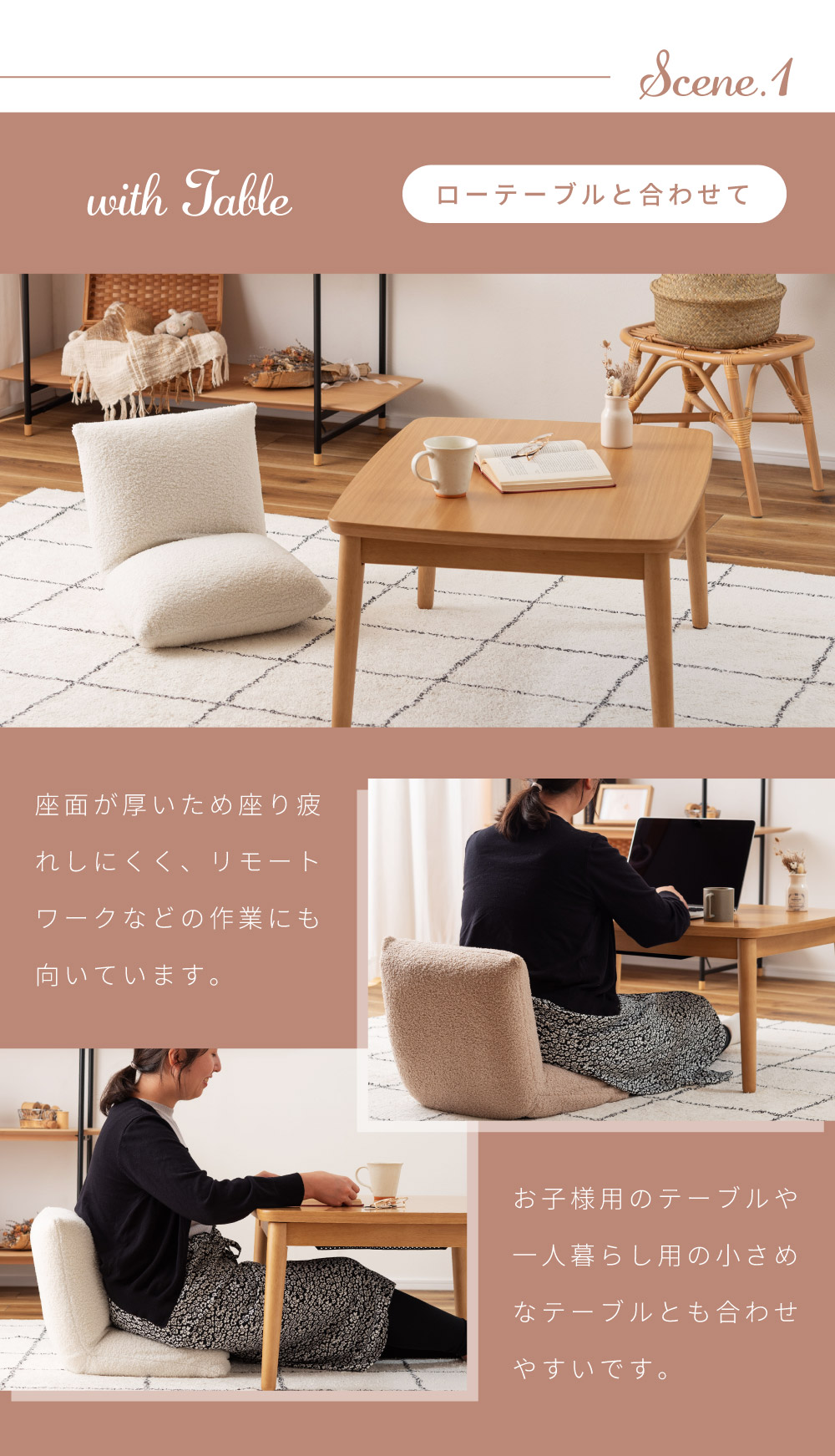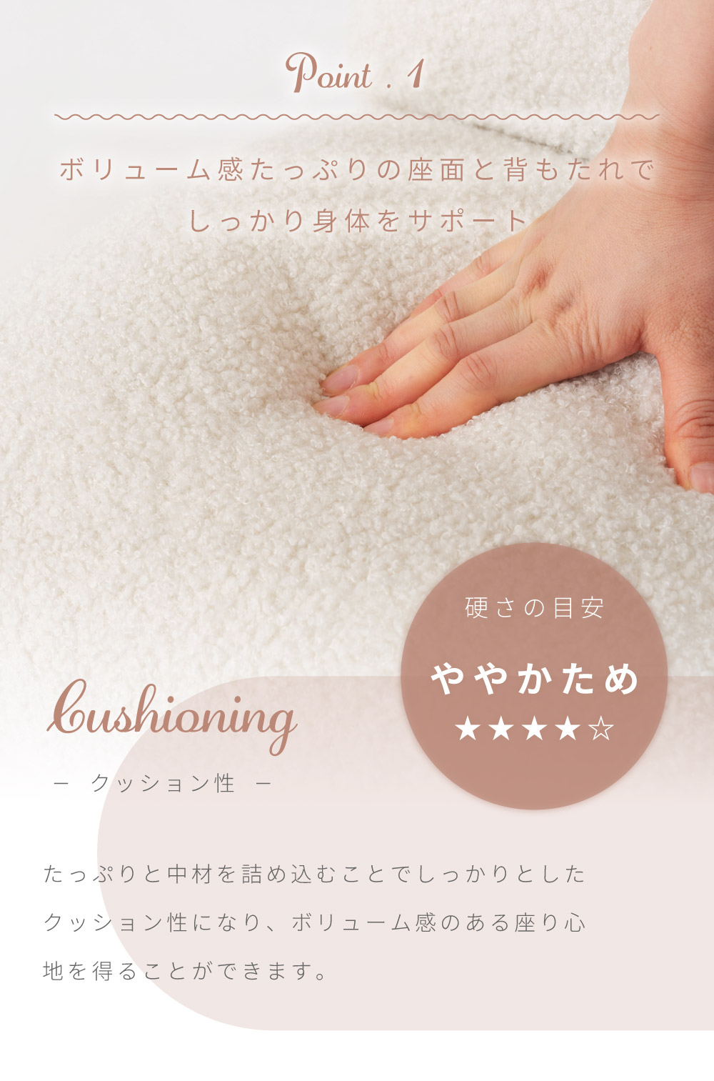 | ポイント | ●流行りの韓国インテリアと相性が良すぎるブークレ生地のフロアチェアができました。 ●ボリューム感たっぷりの座面と背もたれでしっかり身体をサポート たっぷりと中材を詰め込むことでしっかりとしたクッション性になり、ボリューム感のある座り心地を得ることができます。 ●床付き感を抑え、座り疲れを軽減する。 コンパクトなサイズ感ながらも床を感じさせない贅沢な座り心地でお尻をしっかりと支えるため、身体への負荷を軽減し長時間座っても疲れにくいです。 背もたれのクッションも座面と同等のボリューム感を持っているため、もたれかかったときにもしっかりと身体を支え安心感のある座り心地になっています。 ●まるで羊の毛に触れているようなふわふわもこもこのブークレ生地を採用 思わず触ってしまうほどクセになる、人気のブークレ生地を張地に採用しています。 ふわふわと柔らかな起毛は、肌へ触れたときにぬくもりを感じさせてくれます。 ●ブークレ生地とは 表面に糸の輪っか(ブークレ)が出るように加工された生地のことです。 フランス語で「輪」を意味する「bouclé (ブークレ)」に由来してそのように呼ばれています。 ●ブークレ生地の特徴 ・保温性に優れている ・柔らかい起毛で手触りが良い ・フェミニンで愛らしい印象を与える ●背もたれの裏面も共生地を使用 座椅子は背もたれの裏面に黒布が張ってある商品もよく見受けられますが、本製品は背もたれの裏面にも座面と同じ共生地を採用しています。 そのため、後ろから見てもお部屋の雰囲気を崩しません。 ●さまざまなシーンで大活躍、使い方次第でもっと自由な過ごし方を 読書をしたりテレビを見たり・・・、過ごし方は人それぞれ違うからこそ、自分が一番リラックスできる使い方で自由な時間を楽しみましょう。 ●ローテーブルと合わせて 座面が厚いため座り疲れしにくく、リモートワークなどの作業にも向いています。 お子様用のテーブルや一人暮らし用の小さめなテーブルとも合わせやすいです。 ●こたつと合わせて 座面が小さいからこそこたつ内部まで座面が侵入せず、こたつ内部が広々した空間に。 コンパクトなサイズだからこそ、布団との隙間ができにくく保温力を高めます。 ●まくらとして 肌触りの良いブークレ生地だからこそ、お昼寝用まくらとしてもお使いいただけます。 折りたたんで使うことで、ゲームや読書などのリラックスタイムのお供に最適です。 ●コンパクトな折りたたみ式で収納スペースも最小限に 背もたれをパタンと倒せる折りたたみ式になっており、使わないときには場所を取らないコンパクトなサイズになるため保管時も邪魔になりません。 ●背もたれを倒すだけで簡単コンパクト 折りたたみ方法は簡単で、背もたれを思い切り押すことで簡単にたためる仕様となっています。 また、戻す場合は背もたれを押し広げていただければ座椅子の形に戻ります。 ●軽量だから持ち運びもらくらく 商品の重さは約2kgととても軽量で、簡単に持ち運ぶことができます。 |