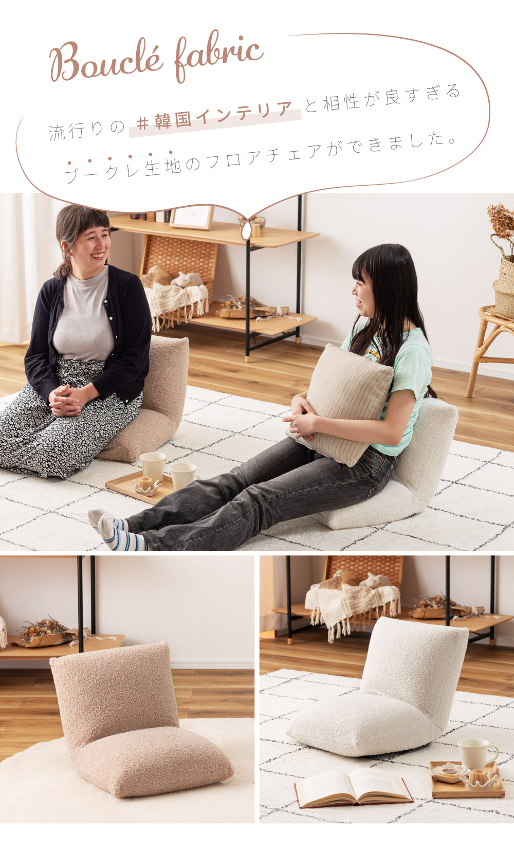 座椅子 1人掛け おしゃれ かわいい ブークレ フロアチェア こたつ 折りたたみ 韓国インテリア ふわふわ もこもこ 背もたれ 肘無し フェミニン 姫系 エレガント クラシック アンティーク リビング まくら 昼寝 持ち運び 軽い 軽量 白 ベージュ ホワイト 畳める シンプル 収納 コンパクト スリム
