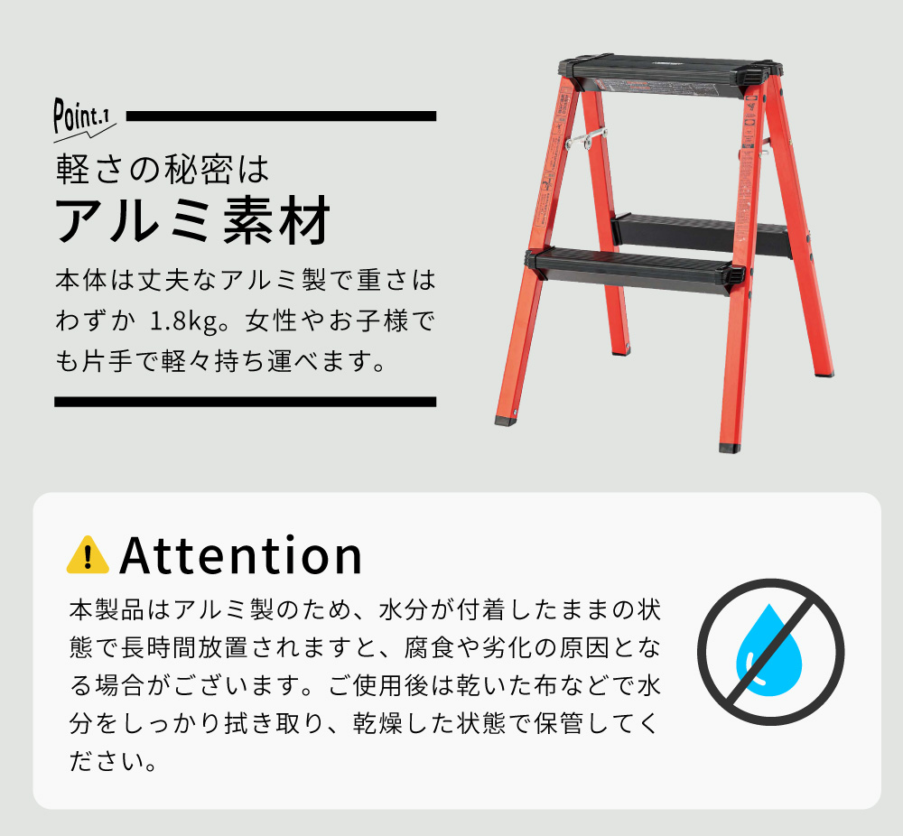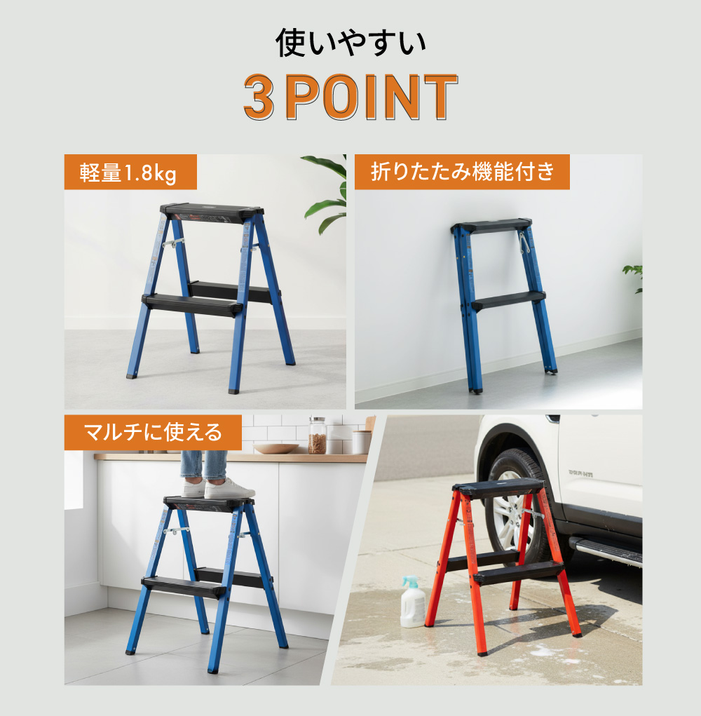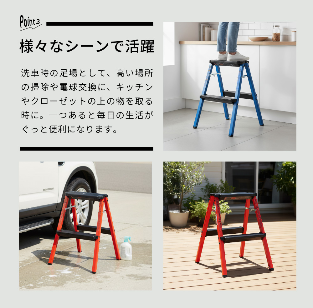 | ポイント | 軽くて丈夫! 洗車やDIYに大活躍のアルミステップ 「ちょっと高いところに手が届かない」 そんな時にサッと出して使える、軽量のステップスツールです。 ●軽さの秘密はアルミ素材 本体は丈夫なアルミ製。女性やお子様でも片手で軽々持ち運べます。 ※本製品はアルミ製のため、水分が付着したままの状態で長時間放置されますと、腐食や劣化の原因となる場合がございます。ご使用後は乾いた布などで水分をしっかり拭き取り、乾燥した状態で保管してください。 ●収納も場所を取らない折りたたみ機能付き 使わないときはスリムにたためる折りたたみ式。家具の隙間や車のトランクなど、ちょっとしたスペースにスッキリ収納できます。 ●様々なシーンで活躍 洗車時の足場として、高い場所の掃除や電球交換に、キッチンやクローゼットの上の物を取る時に。一つあると毎日の生活がぐっと便利になります。 |