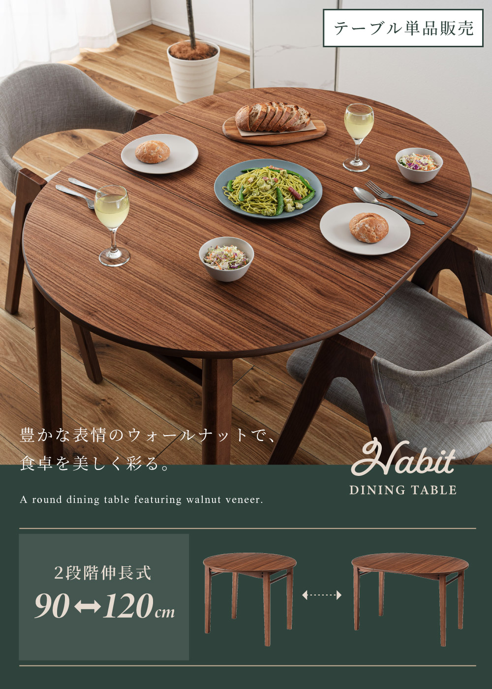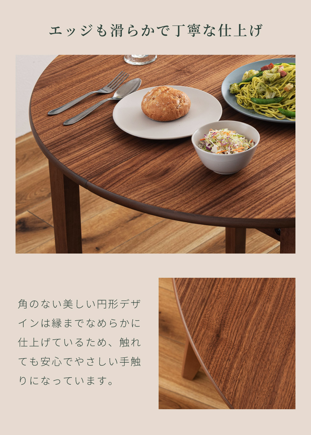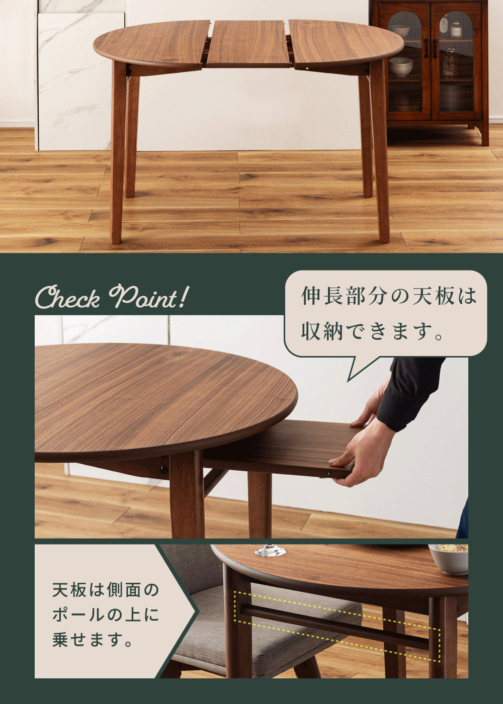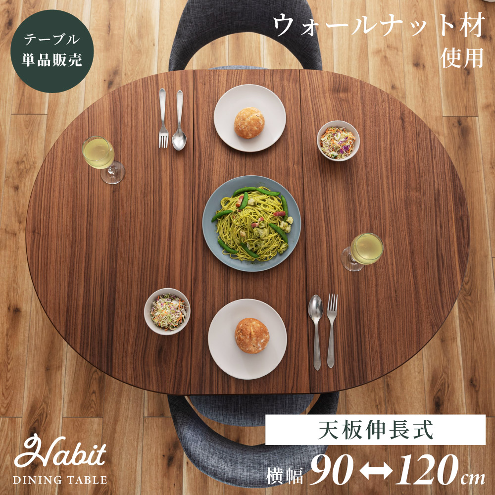 | ポイント | ●短辺を使って最大4人まで座れる。 2人だとゆったり広々使えて、4人だと収まり良く座れるジャストサイズに。 ●限られた空間でも置きやすいサイズ。 1人〜2人での普段使いとして丁度良く、コンパクトなサイズで場所を取りません。 ●工具不要でスムーズに伸長できる4ステップの簡単伸長 1.天板裏のロックを外し、天板の短辺を引きます。 2.天板を最大まで引いて伸長させます。 3.伸長部分の天板を設置します。 4.天板を両端から内側へ押し、ロックをして完成。 縮小させたいときは、STEP4〜1の手順で行うことで簡単に縮小させることができます。 ●天板は側面のポールの上に伸長部分の天板を乗せることで、伸長天板を収納できます。 ●ウォールナット突板で高級感を演出 ウォールナットを突板仕上げにすることで無垢材に比べ反りや割れが起きにくく、高級感と実用性を兼ね備えています。 ●「突板仕上げ」とは 突板とは、天然木を薄くスライスして表面に貼り合わせた天板の仕上げ方法です。 無垢材と同じような感覚で天然木の風合いを楽しめるだけでなく、無垢材に比べて反りや割れが起こりにくいため、日常使いにとても適しています。 ●エッジも滑らかで丁寧な仕上げ 角のない美しい円形デザインは縁までなめらかに仕上げているため、触れても安心でやさしい手触りになっています。 ●ウレタン塗装で水や汚れにも強い ウレタン塗装とは、ウレタン樹脂で表面をコーティングする塗装方法です。 木材の表面に透明で丈夫な塗膜を形成し、素材を保護しつつ美しさを引き立てます。 ●チェアと合わせやすい高さ72cm 床から天板までの高さは72cmと一般的なチェアと合わせやすい高さ設計のため、テーブルだけの買い替えも検討しやすいサイズです。 ●デスクワークやPC作業に ノートPCと資料、マグカップやタブレットを同時に置いても余裕があり、在宅ワークや趣味の作業スペースとしても十分お使いいただくことができます。 ●カフェ気分でくつろぎタイム 円形ならではのやわらかなフォルムが空間をやさしく演出し、おうちにいながらまるでカフェで過ごしているようなリラックスできる雰囲気を作ります。 ●家族や友人と食事を楽しむ 4人で囲んでも余裕のある広さで、料理を並べやすく取り分けもスムーズ。円形ならではの一体感が生まれ、毎日の食卓を心地よい時間に変えてくれます。 ●工具不要で組み立て簡単 付属のボルトと六角レンチで脚とポールを取り付けるだけの簡単な組み立てで完成します。 |