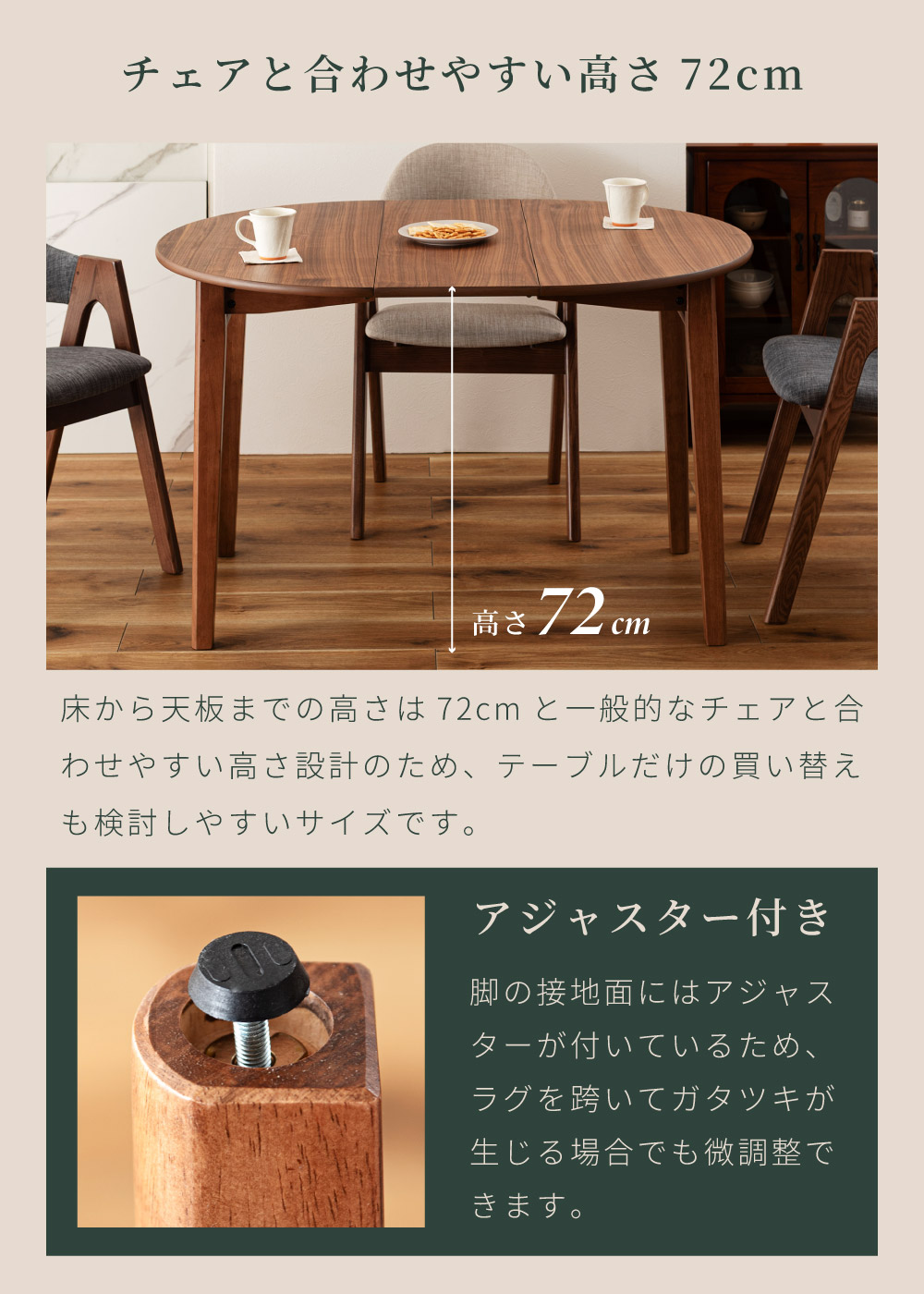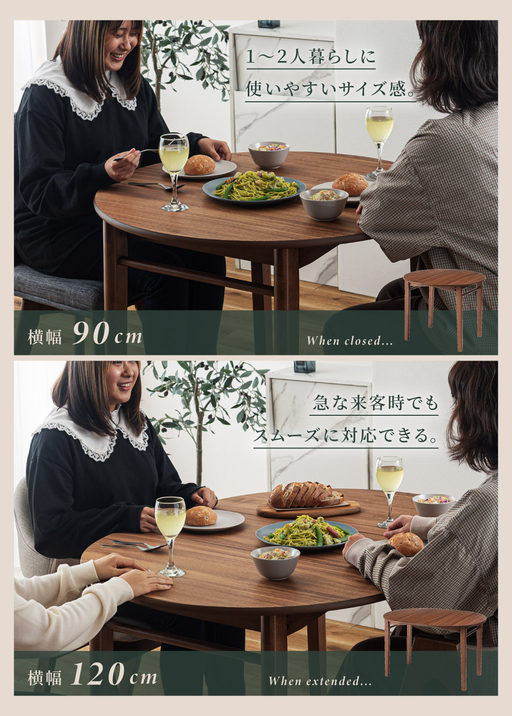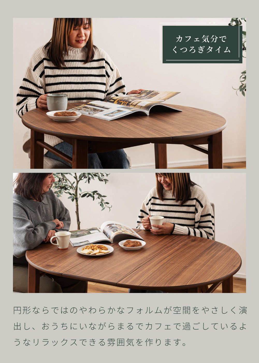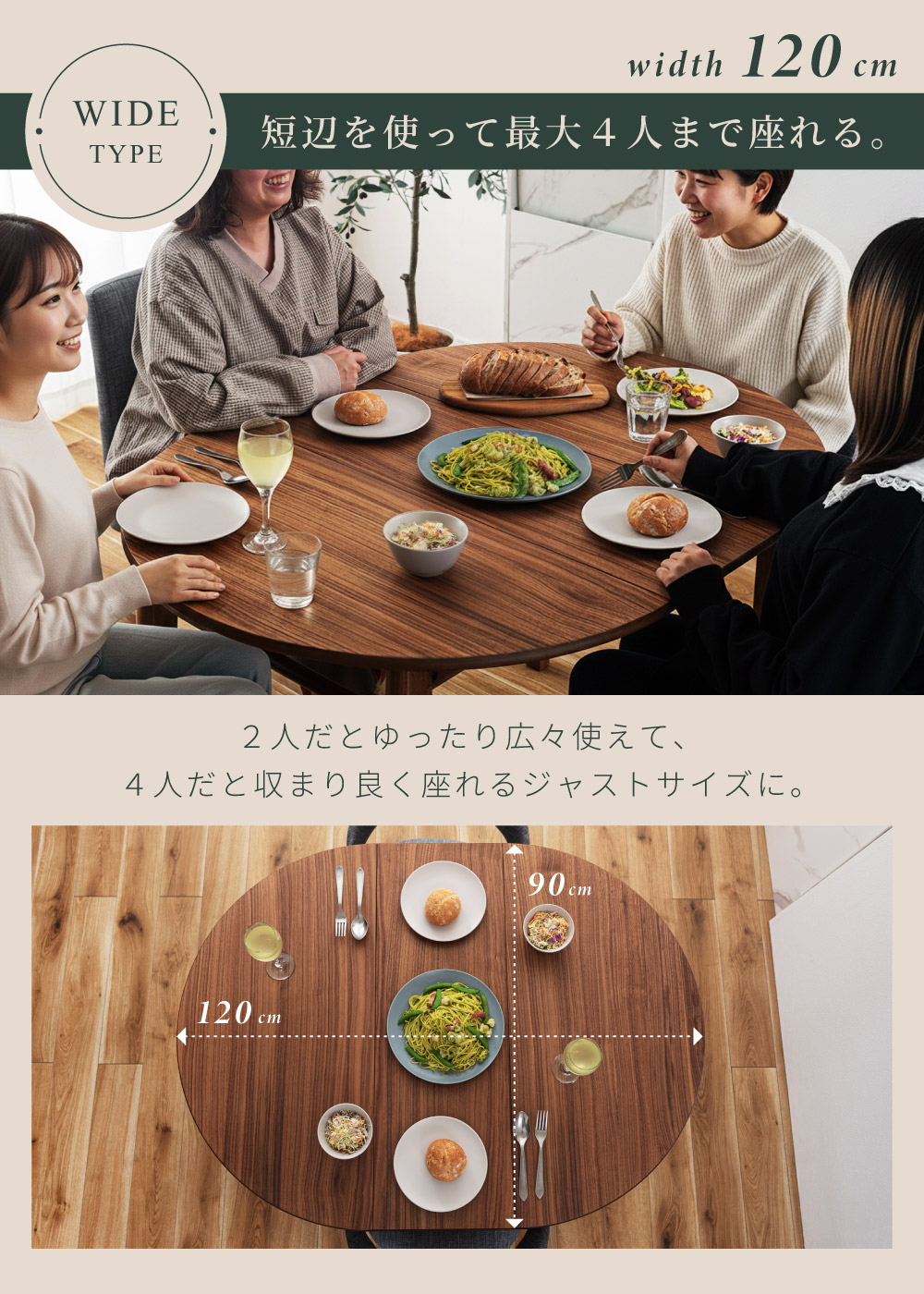 | ポイント | ●短辺を使って最大4人まで座れる。 2人だとゆったり広々使えて、4人だと収まり良く座れるジャストサイズに。 ●限られた空間でも置きやすいサイズ。 1人〜2人での普段使いとして丁度良く、コンパクトなサイズで場所を取りません。 ●工具不要でスムーズに伸長できる4ステップの簡単伸長 1.天板裏のロックを外し、天板の短辺を引きます。 2.天板を最大まで引いて伸長させます。 3.伸長部分の天板を設置します。 4.天板を両端から内側へ押し、ロックをして完成。 縮小させたいときは、STEP4〜1の手順で行うことで簡単に縮小させることができます。 ●天板は側面のポールの上に伸長部分の天板を乗せることで、伸長天板を収納できます。 ●ウォールナット突板で高級感を演出 ウォールナットを突板仕上げにすることで無垢材に比べ反りや割れが起きにくく、高級感と実用性を兼ね備えています。 ●「突板仕上げ」とは 突板とは、天然木を薄くスライスして表面に貼り合わせた天板の仕上げ方法です。 無垢材と同じような感覚で天然木の風合いを楽しめるだけでなく、無垢材に比べて反りや割れが起こりにくいため、日常使いにとても適しています。 ●エッジも滑らかで丁寧な仕上げ 角のない美しい円形デザインは縁までなめらかに仕上げているため、触れても安心でやさしい手触りになっています。 ●ウレタン塗装で水や汚れにも強い ウレタン塗装とは、ウレタン樹脂で表面をコーティングする塗装方法です。 木材の表面に透明で丈夫な塗膜を形成し、素材を保護しつつ美しさを引き立てます。 ●チェアと合わせやすい高さ72cm 床から天板までの高さは72cmと一般的なチェアと合わせやすい高さ設計のため、テーブルだけの買い替えも検討しやすいサイズです。 ●デスクワークやPC作業に ノートPCと資料、マグカップやタブレットを同時に置いても余裕があり、在宅ワークや趣味の作業スペースとしても十分お使いいただくことができます。 ●カフェ気分でくつろぎタイム 円形ならではのやわらかなフォルムが空間をやさしく演出し、おうちにいながらまるでカフェで過ごしているようなリラックスできる雰囲気を作ります。 ●家族や友人と食事を楽しむ 4人で囲んでも余裕のある広さで、料理を並べやすく取り分けもスムーズ。円形ならではの一体感が生まれ、毎日の食卓を心地よい時間に変えてくれます。 ●工具不要で組み立て簡単 付属のボルトと六角レンチで脚とポールを取り付けるだけの簡単な組み立てで完成します。 |