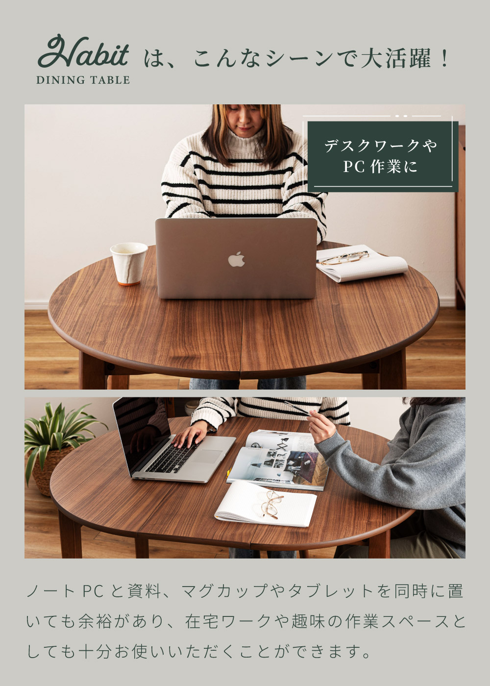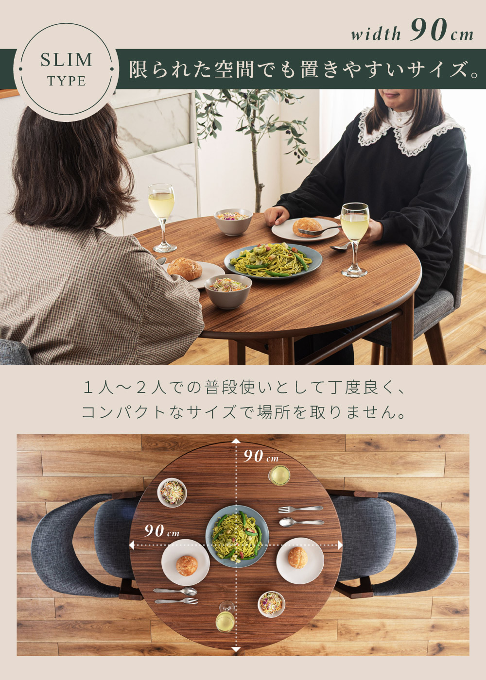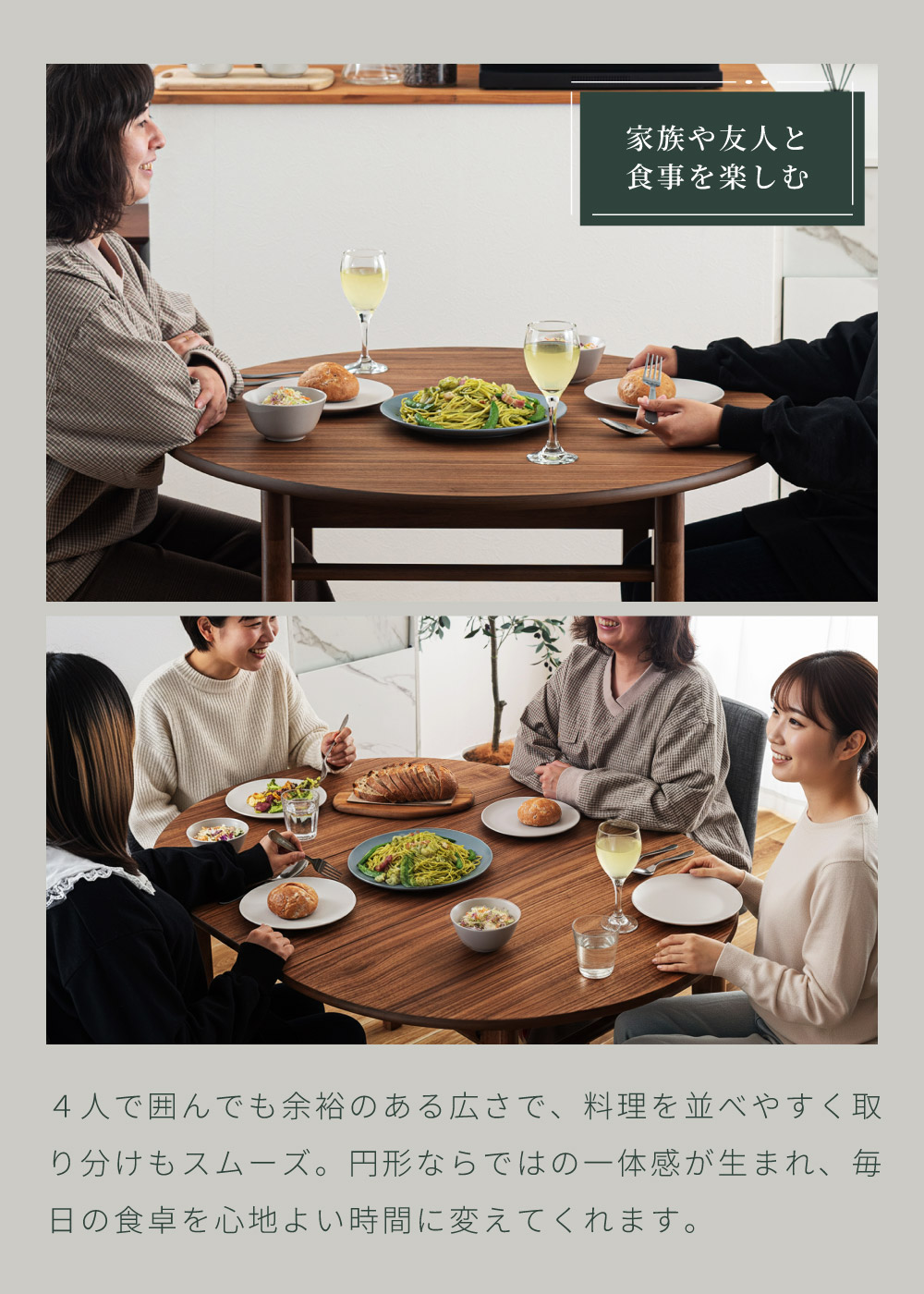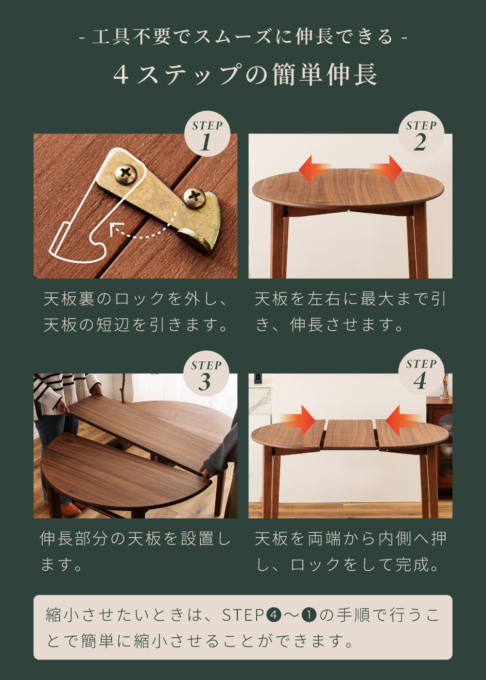 | ポイント | ●短辺を使って最大4人まで座れる。 2人だとゆったり広々使えて、4人だと収まり良く座れるジャストサイズに。 ●限られた空間でも置きやすいサイズ。 1人〜2人での普段使いとして丁度良く、コンパクトなサイズで場所を取りません。 ●工具不要でスムーズに伸長できる4ステップの簡単伸長 1.天板裏のロックを外し、天板の短辺を引きます。 2.天板を最大まで引いて伸長させます。 3.伸長部分の天板を設置します。 4.天板を両端から内側へ押し、ロックをして完成。 縮小させたいときは、STEP4〜1の手順で行うことで簡単に縮小させることができます。 ●天板は側面のポールの上に伸長部分の天板を乗せることで、伸長天板を収納できます。 ●ウォールナット突板で高級感を演出 ウォールナットを突板仕上げにすることで無垢材に比べ反りや割れが起きにくく、高級感と実用性を兼ね備えています。 ●「突板仕上げ」とは 突板とは、天然木を薄くスライスして表面に貼り合わせた天板の仕上げ方法です。 無垢材と同じような感覚で天然木の風合いを楽しめるだけでなく、無垢材に比べて反りや割れが起こりにくいため、日常使いにとても適しています。 ●エッジも滑らかで丁寧な仕上げ 角のない美しい円形デザインは縁までなめらかに仕上げているため、触れても安心でやさしい手触りになっています。 ●ウレタン塗装で水や汚れにも強い ウレタン塗装とは、ウレタン樹脂で表面をコーティングする塗装方法です。 木材の表面に透明で丈夫な塗膜を形成し、素材を保護しつつ美しさを引き立てます。 ●チェアと合わせやすい高さ72cm 床から天板までの高さは72cmと一般的なチェアと合わせやすい高さ設計のため、テーブルだけの買い替えも検討しやすいサイズです。 ●デスクワークやPC作業に ノートPCと資料、マグカップやタブレットを同時に置いても余裕があり、在宅ワークや趣味の作業スペースとしても十分お使いいただくことができます。 ●カフェ気分でくつろぎタイム 円形ならではのやわらかなフォルムが空間をやさしく演出し、おうちにいながらまるでカフェで過ごしているようなリラックスできる雰囲気を作ります。 ●家族や友人と食事を楽しむ 4人で囲んでも余裕のある広さで、料理を並べやすく取り分けもスムーズ。円形ならではの一体感が生まれ、毎日の食卓を心地よい時間に変えてくれます。 ●工具不要で組み立て簡単 付属のボルトと六角レンチで脚とポールを取り付けるだけの簡単な組み立てで完成します。 |