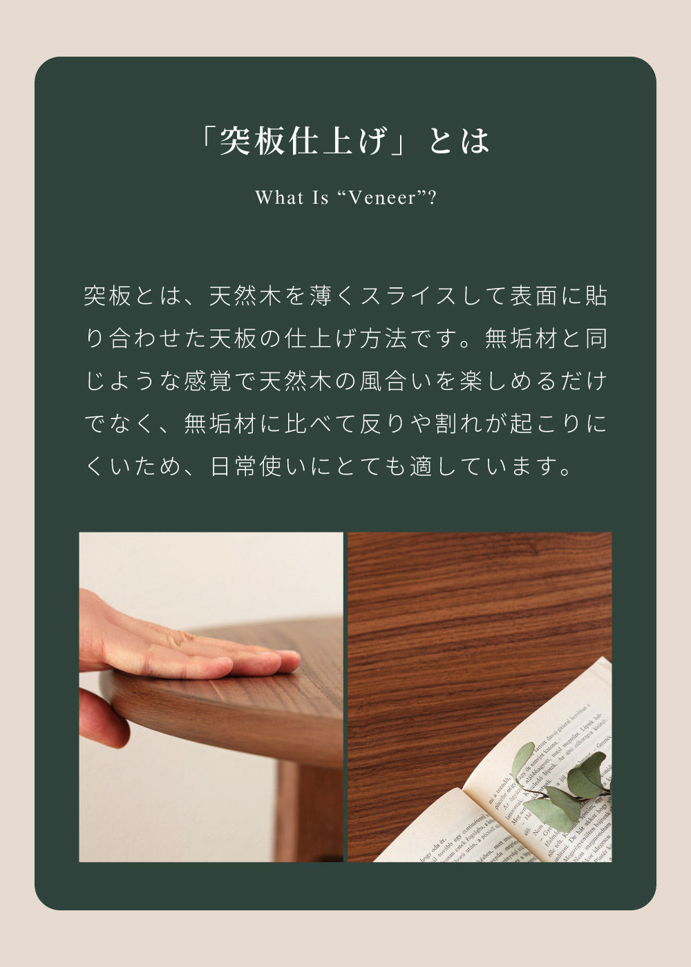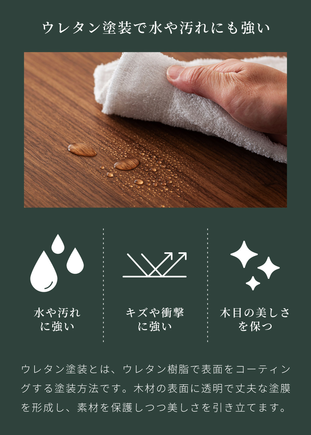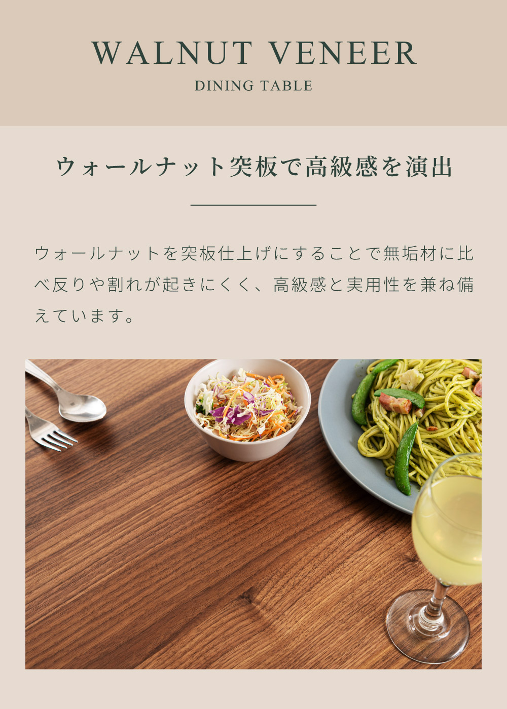 | 材質 | 天板:MDF/ウォールナット突板/ウレタン塗装 脚・幕板:ラバーウッド/ラッカー塗装 |