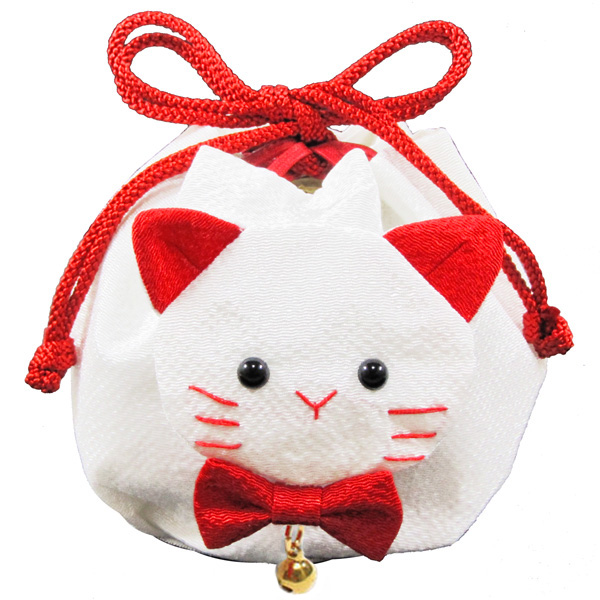 蝶ネクタイを付けた白猫のコロンと丸い子ども用巾着です。普段使いにもどうぞ。