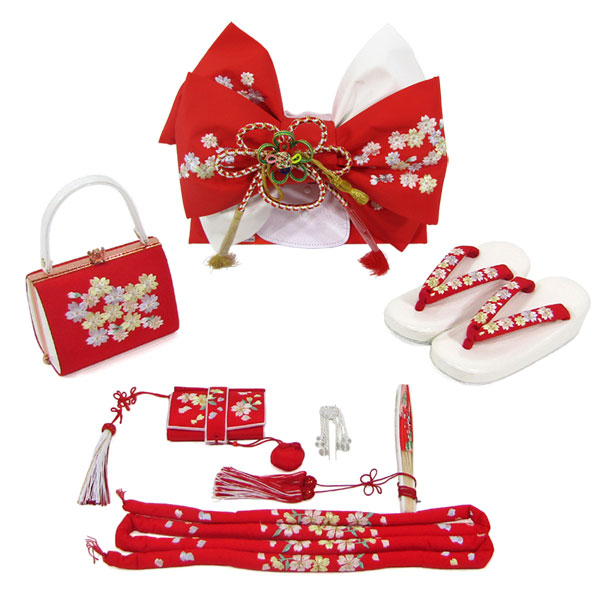 刺繍入り結び帯と箱せこや小物の7点セットです。