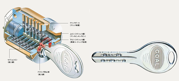 18本のピンすべてにアンチピッキングピンを使用。また、鍵穴(キーセクション)内に配置した2本の焼入鋼製のセクションピンが、不正解錠用の工具の進入を防ぎます。