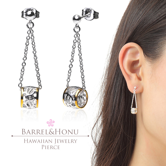 | 詳細 | バレル(樽)のチャームがついたロングチェーンピアス。 バレルの透かし柄は、かわいいホヌ(ウミガメ)。 両サイドの部分にはイエローゴールドのコーティングが施されています。 ハワイでは、ホヌは海の神様として大切にされており、幸せの神様ともいわれています。 また、樽の中には夢が詰まっているといわれており、樽の中の夢を成熟し成功へと導く、また先が見通せるということで、縁起のいいモチーフとされています。 また、ピアスとペンダントを合わせてコーディネートしたいという方は、当店で扱っております同シリーズペンダントをぜひご検討ください。 >>ペンダントはこちら こちらの商品は2個セット(両耳用)です。 離島の送料はその都度お見積りさせていただきます。 |