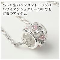 ハワイ直輸入のハワイアンジュエリーペンダントトップです。バレル型(樽型、チューブ型とも言います。)のペンダントトップはハワイアンジュエリーの中でも定番となっています。樽の中に夢を詰め込み、熟成させて夢をかなえるという縁起のいい意味合いがあり、プレゼントにも最適ですよ。こちらはプルメリアデザインでお花の真ん中にピンクのジルコニアが入っています。お色違いもございますのでお友達とお揃いにされるのも素敵ですね。