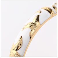 | 詳細 | スターフィッシュ(ヒトデ)をデザインしました。デザイン部分は、ゴールドのメッキで波柄のようなヒトデ柄がポイントです。マリンなデザインでもありますよね。かわいさと、かっこよさが混ざった感じで、印象的です。シンプルでいてゴージャス感もありますが、決して下品な感じにならないのが、エナメルの質感の特徴です。 ヒンジで簡単に開いて留まるので、とてもつけやすく、外しやすいので、バングルアクセサリーとしての面倒なことが無いのが使いやすくて良いです。 エナメルの独特の光沢がはまってしまいそうです!いろんなシーンで活躍しそうです。ハワイでも大人気アイテムです。フラをされてる方などにも人気です ちょっと前までは、古典柄が多かったのですが、最近のトレンドを意識したデザインが登場したので、当店でもぜひ、ご紹介させていただきたいと思い、今回メーカー在庫を調整していただき、輸入することになりました。この機会に是非ご検討ください! *エナメル部分は写真のように一部の色は、マーブル(むら)加工をしています。一点一点違いますので、それも味と思ってお楽しみください。 |