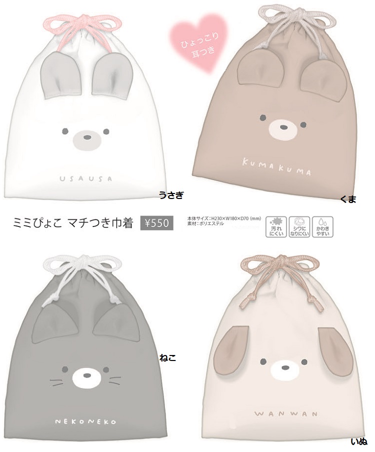 ミミぴょこ マチ付き巾着袋小 コップ袋 ランチ巾着 コップ入れ クーリア 巾着 女の子 男の子 給食マスク入れ お手ふき入れ 小さめ巾着 巾着袋小