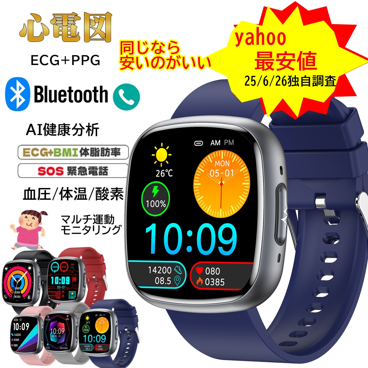 スマートウォッチ 通話機能 ECG心電図 他社9800円を 血圧測定 血中脂質 尿酸 AI診断 皮膚温 高精度心拍数 血中酸素 睡眠 着信通知 24時間健康管理 SOS