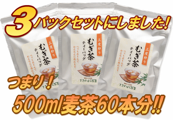 ペットボトルに入れて作れる麦茶ティーバッグ20本入りが3パック。500mlの出来立ての香りよい麦茶が60本分作れるお得なセットです。