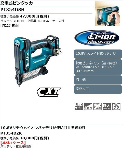 マキタ 充電式ピンタッカ PT354DSH (バッテリBL1015・充電器DC10SA・ケース付)10.8V リチウムイオンバッテリー