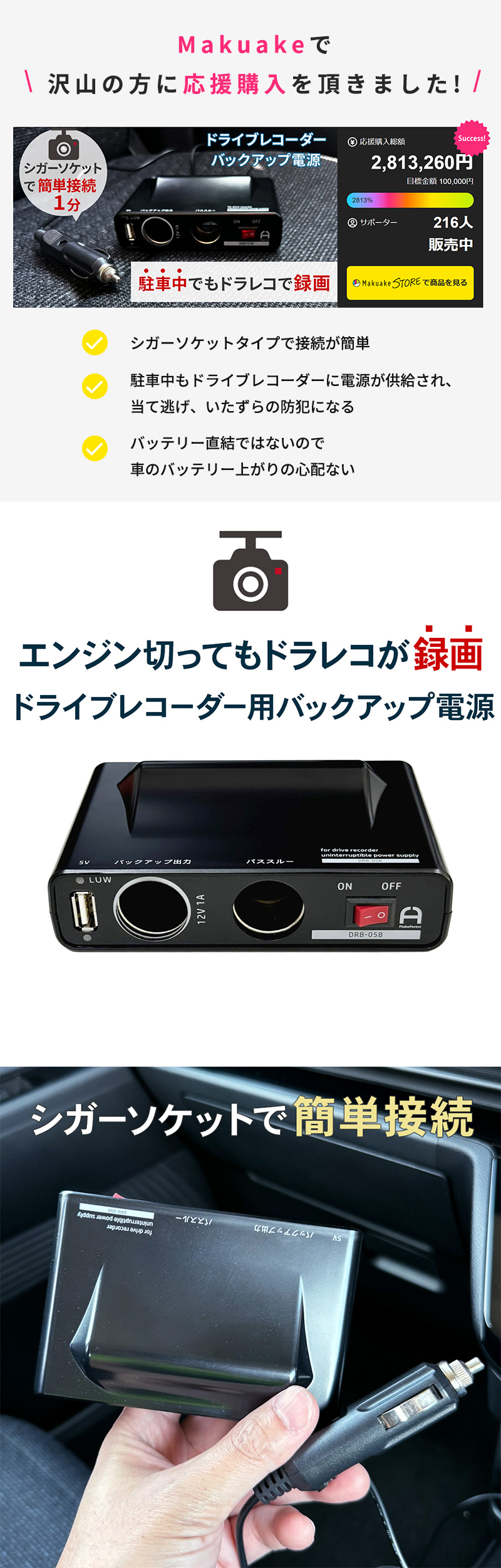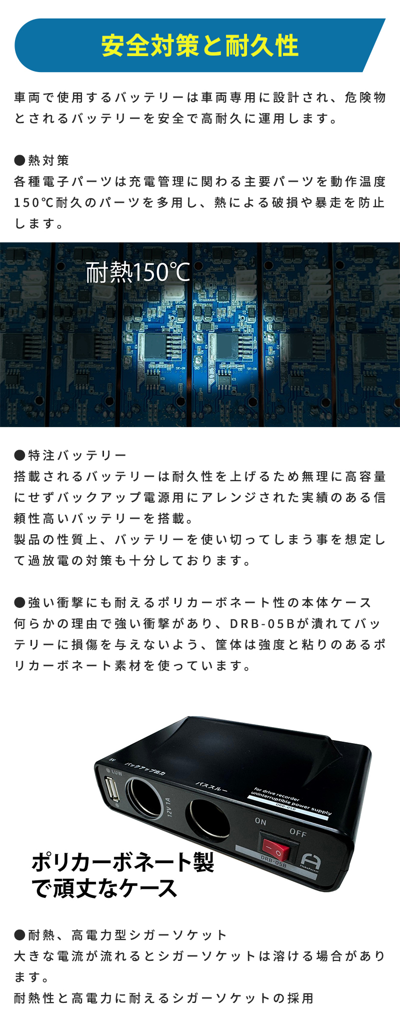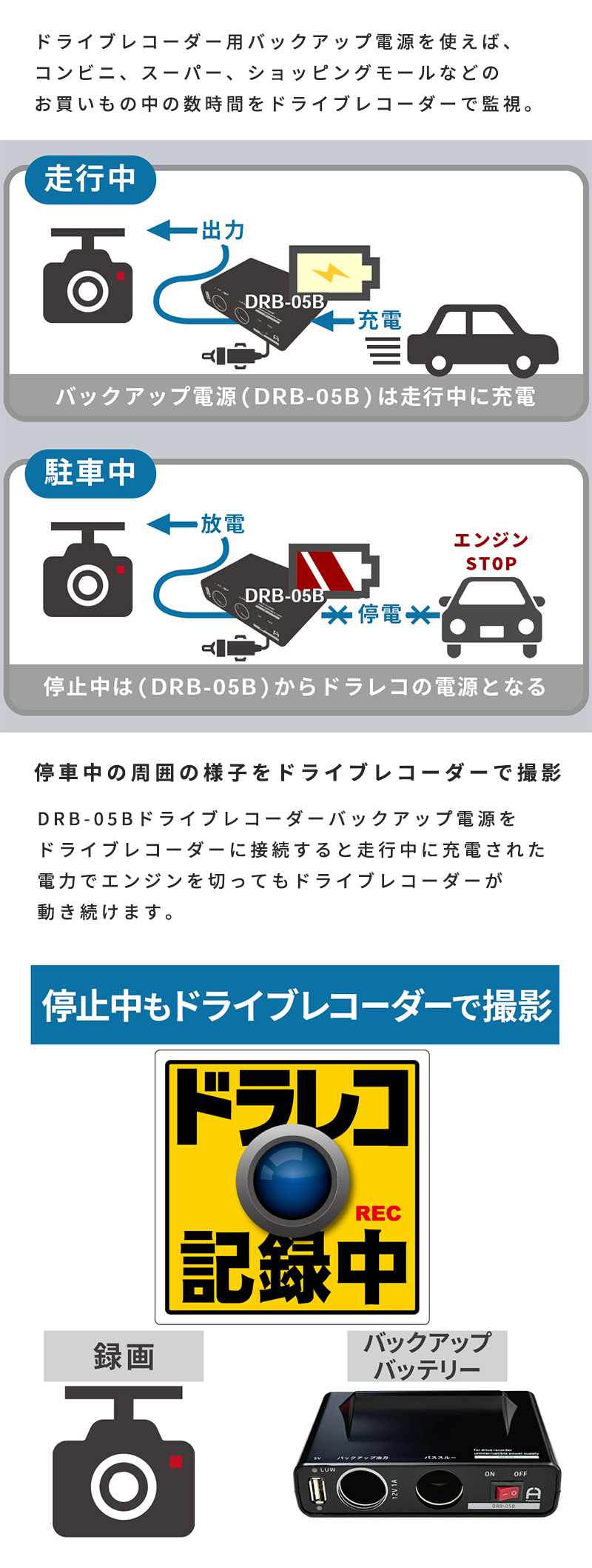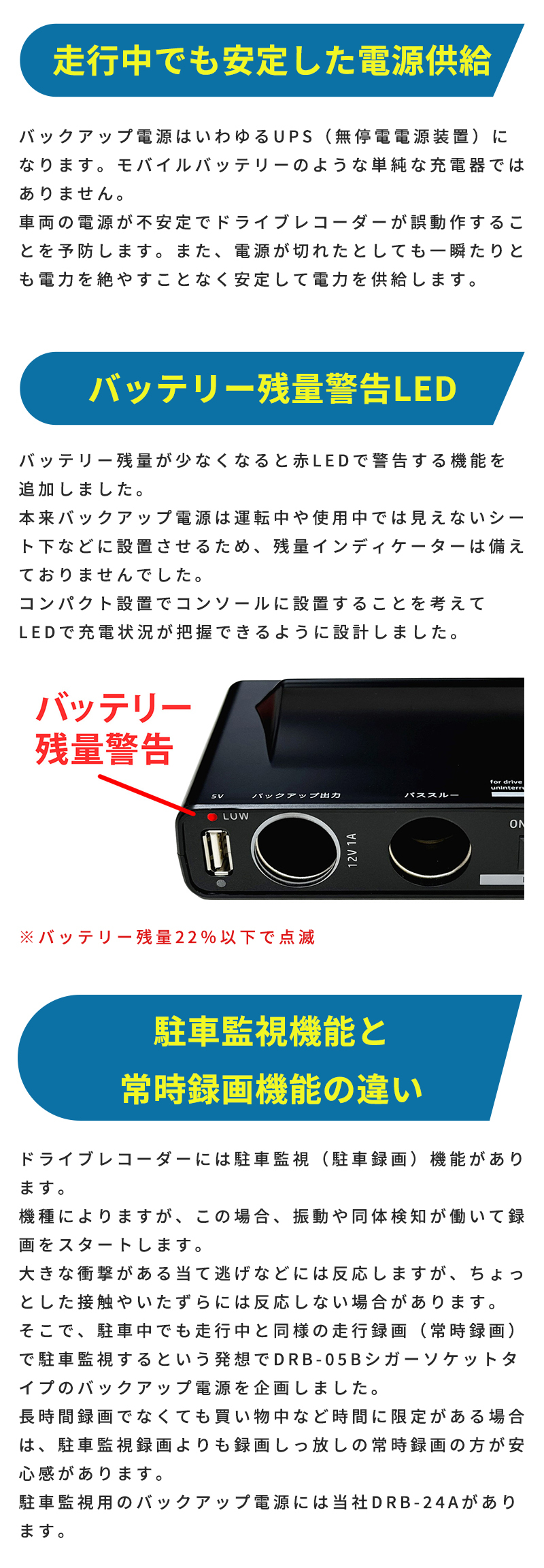 | 駐車中の当て逃げドアパンチ対策に。エンジン切ってもドラレコが動くバックアップ電源 ドライブレコーダー用バックアップ電源DRB-05B シガーソケットで簡単接続 駐車中もドライブレコーダーに電源が供給され、当て逃げ、いたずらの防犯に バッテリー直結ではないので、車のバッテリー上がりの心配もなし ドライブレコーダー用バックアップ電源を使えば、 コンビニ、スーパー、ショッピングモールなどのお買い物中の数時間をドライブレコーダーで監視。 バックアップ電源(DRB-05B)は走行中に充電し、 停止中はDRB-05Bがドラレコの電源となります。 停止中の周囲の様子をドライブレコーダーで撮影 DBR-05Bドライブレコーダーバックアップ電源をドライブレコーダーに接続すると、 走行中に充電された電力でエンジンを切ってもドライブレコーダーが動き続けます。 ドライブレコーダーをシガーソケットで車と接続している場合は設置が簡単。 軽量コンパクトなデザインで車内のどこでも設置可能です。 2時間の充電で一般的なドライブレコーダーの約5時間分の動作を想定して作られています。 手軽に作られている反面、バックアップ時間は短く設定されています。 バックアップをする/しないの切替スイッチをフロントパネルに搭載しています。 自宅の駐車場や室内駐車場ではバックアップを中止してバッテリーを節約し、 外出先の駐車場のみバックアップする といった選択も可能です。 2台連結すると容量が2倍になる機能が搭載されています。 バックアップ時間が足りない場合は2台連結すると、バックアップ時間が長くなります。 車両で仕様するバッテリーは車両専用に設計され、危険物とされるバッテリーを安全で高耐久に運用します。 ・熱対策 各種電子パーツは充電管理に関わる主要パーツを動作温度150℃耐久のパーツを多用しており、 熱による破損や暴走を防止します。 ・特注バッテリー 搭載されるバッテリーは耐久性を上げるため高容量にせず、バックアップ電源用にアレンジされた実績のある信頼性高いバッテリーを搭載しています。 ・強い衝撃にも耐えるポリカーボネート性の本体ケース 筺体は強度と粘りのあるポリカーボネート素材を使用し、バッテリーを守ります。 ・耐熱、高電力型シガーソケット 耐熱性と高電力に耐えるシガーソケットを採用しています。 バッテリー残量が少なくなると赤LEDで警告する機能が搭載されています。 ※バッテリー22%以下で点滅 |