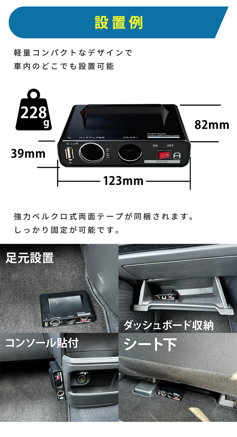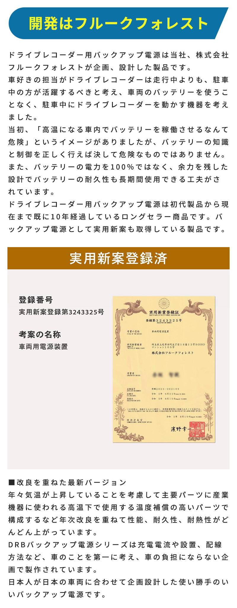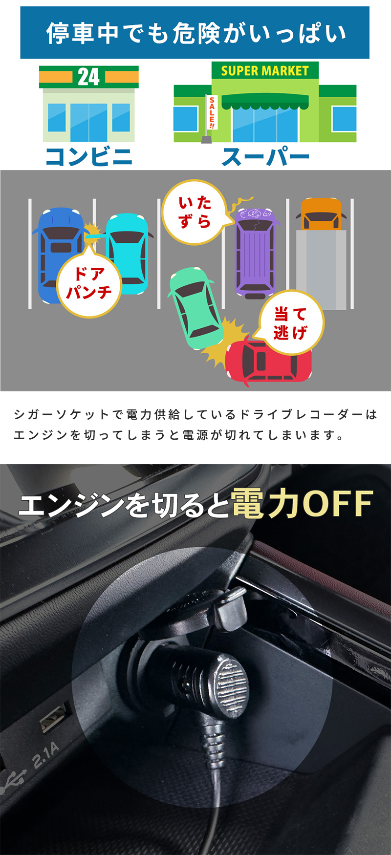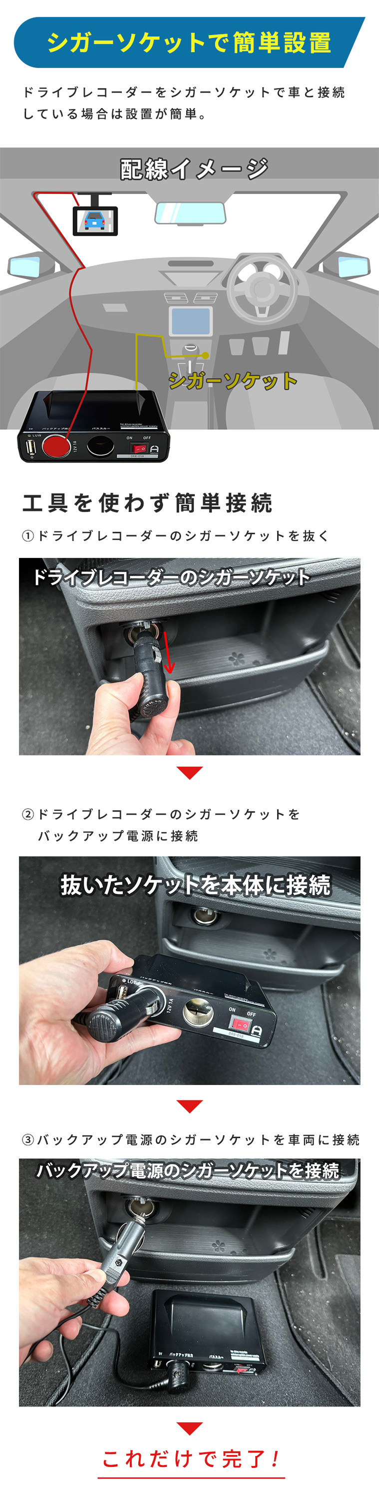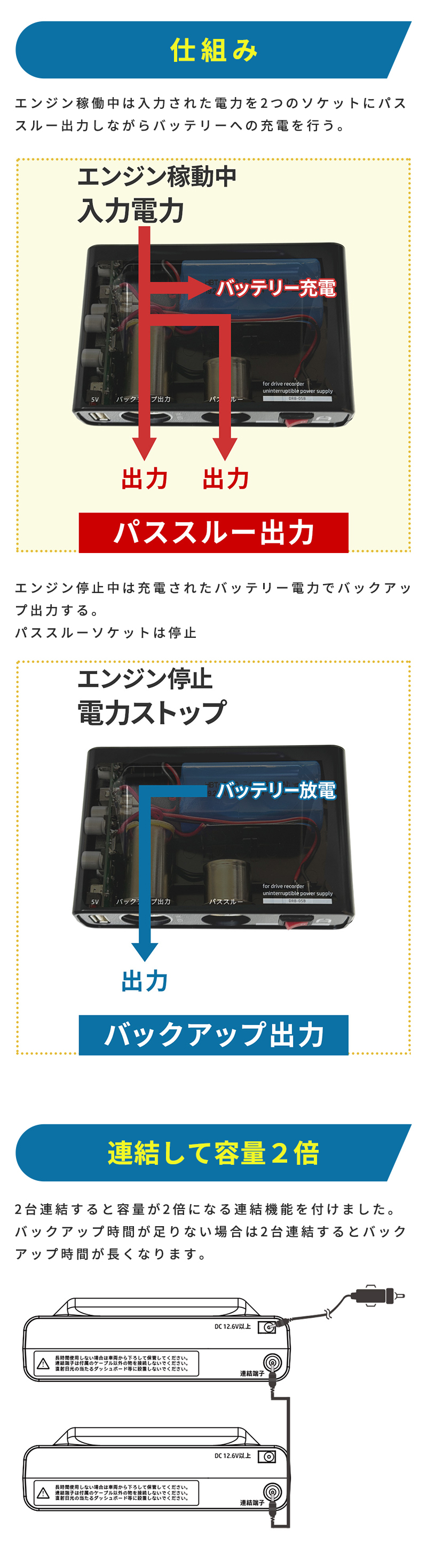 | 駐車中の当て逃げドアパンチ対策に。エンジン切ってもドラレコが動くバックアップ電源 ドライブレコーダー用バックアップ電源DRB-05B シガーソケットで簡単接続 駐車中もドライブレコーダーに電源が供給され、当て逃げ、いたずらの防犯に バッテリー直結ではないので、車のバッテリー上がりの心配もなし ドライブレコーダー用バックアップ電源を使えば、 コンビニ、スーパー、ショッピングモールなどのお買い物中の数時間をドライブレコーダーで監視。 バックアップ電源(DRB-05B)は走行中に充電し、 停止中はDRB-05Bがドラレコの電源となります。 停止中の周囲の様子をドライブレコーダーで撮影 DBR-05Bドライブレコーダーバックアップ電源をドライブレコーダーに接続すると、 走行中に充電された電力でエンジンを切ってもドライブレコーダーが動き続けます。 ドライブレコーダーをシガーソケットで車と接続している場合は設置が簡単。 軽量コンパクトなデザインで車内のどこでも設置可能です。 2時間の充電で一般的なドライブレコーダーの約5時間分の動作を想定して作られています。 手軽に作られている反面、バックアップ時間は短く設定されています。 バックアップをする/しないの切替スイッチをフロントパネルに搭載しています。 自宅の駐車場や室内駐車場ではバックアップを中止してバッテリーを節約し、 外出先の駐車場のみバックアップする といった選択も可能です。 2台連結すると容量が2倍になる機能が搭載されています。 バックアップ時間が足りない場合は2台連結すると、バックアップ時間が長くなります。 車両で仕様するバッテリーは車両専用に設計され、危険物とされるバッテリーを安全で高耐久に運用します。 ・熱対策 各種電子パーツは充電管理に関わる主要パーツを動作温度150℃耐久のパーツを多用しており、 熱による破損や暴走を防止します。 ・特注バッテリー 搭載されるバッテリーは耐久性を上げるため高容量にせず、バックアップ電源用にアレンジされた実績のある信頼性高いバッテリーを搭載しています。 ・強い衝撃にも耐えるポリカーボネート性の本体ケース 筺体は強度と粘りのあるポリカーボネート素材を使用し、バッテリーを守ります。 ・耐熱、高電力型シガーソケット 耐熱性と高電力に耐えるシガーソケットを採用しています。 バッテリー残量が少なくなると赤LEDで警告する機能が搭載されています。 ※バッテリー22%以下で点滅 |