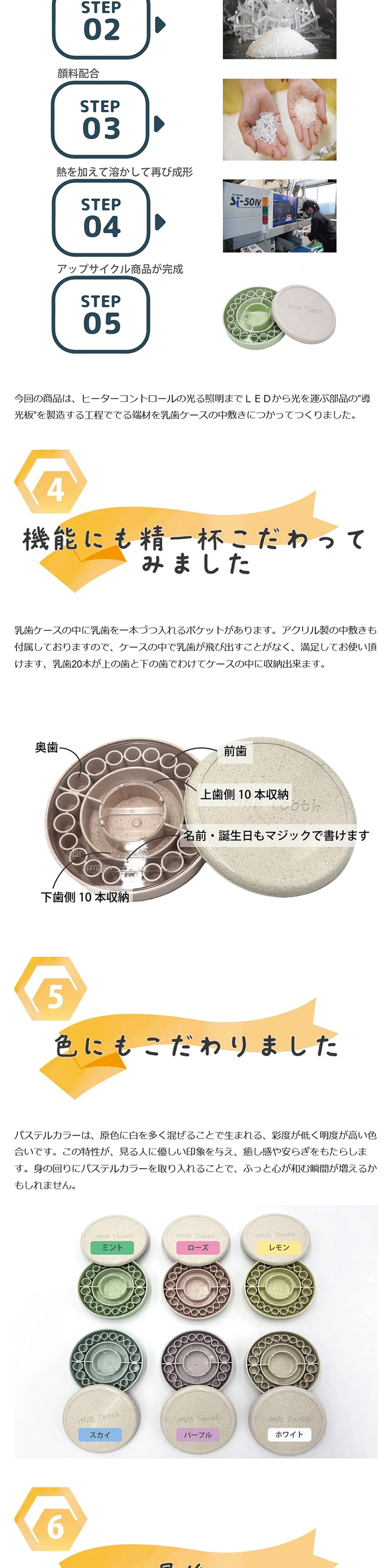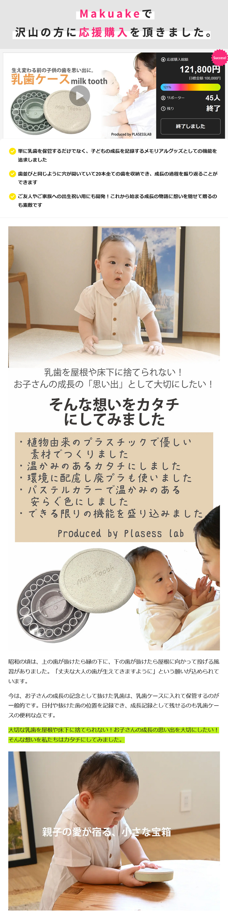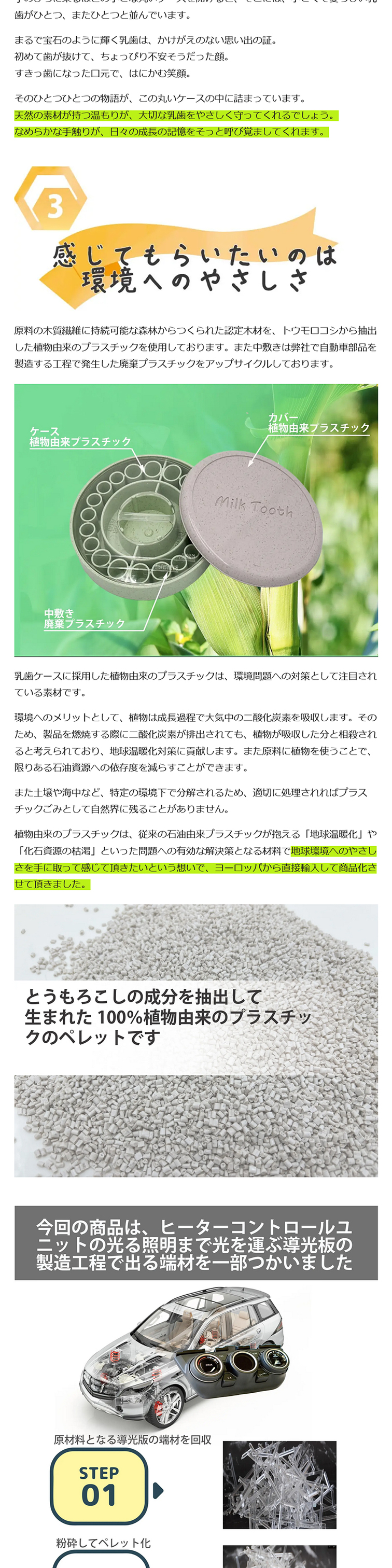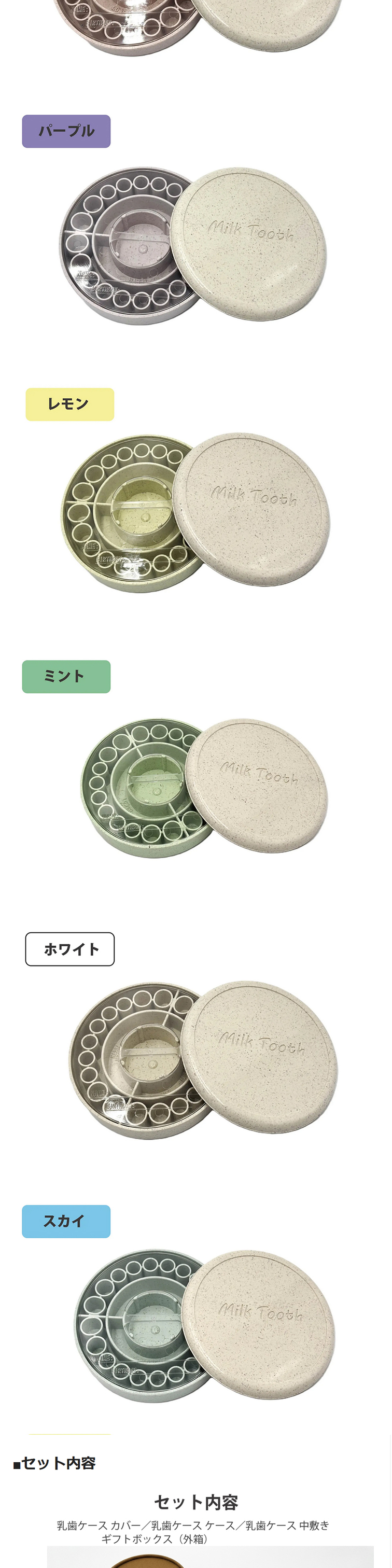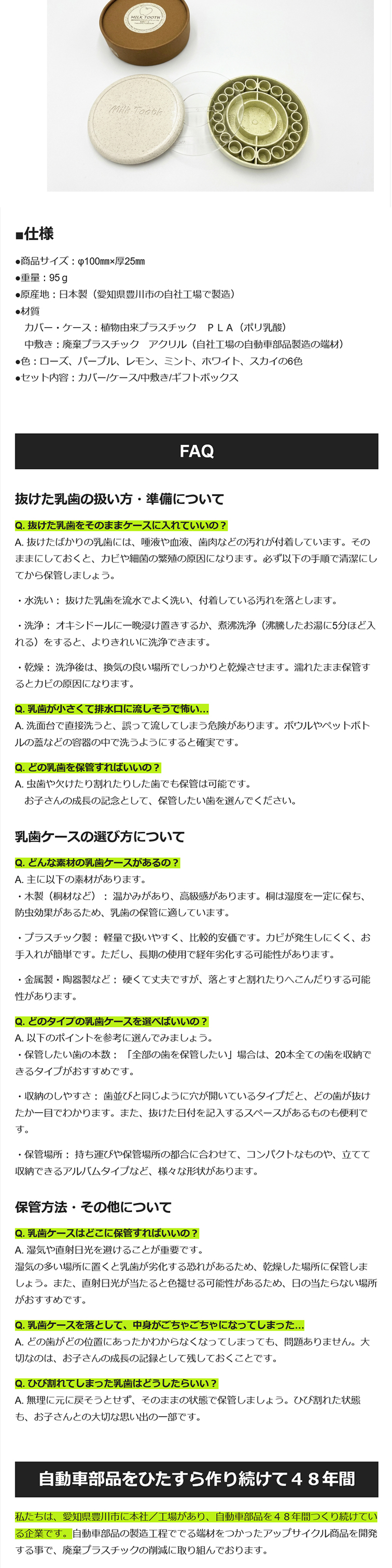 | 1.届けたいのはモノじゃなく温もりと想いです 生まれたばかりのお子さんのこれから始まる成長의物語に想いを馳せて贈るのも素敵です! 5歳から7歳くらいで乳歯が抜け始める頃に新たな段階への成長を想い贈ると喜ばれます 特に初めて乳歯が抜けたタイミングに合わせて贈ると感動もひとしおでしょう! 温もりを感じる素材と色にこだわり開発しました! 乳歯ケースに詰まった物語は、お子さん自身が歩んできた成長の証であり、ご家族にとってかけがえのない宝物となります。 2.こだわったのもカタチではなく温もりと想いです 両手で包み込めるようなサイズで角を丸く削った優しい曲線は、触れるたびに温もりを感じさせますで、安らぎ感を与えます。 天然の素材が持つ温もりが、大切な乳歯をやさしく守ってくれるでしょう。 なめらかな手触りが、日々の成長の記憶をそっと呼び覚ましてくれます。 3.感じてもらいたのは環境へのやさしさ 原料の木質繊維に持続可能な森林からつくられた認定木材を、トウモロコシから抽出した植物由来のプラスチックを使用しております。 また中敷きは弊社で自動車部品を製造する工程で発生した廃棄プラスチックをアップサイクルしております。 4.機能にも精一杯こだわってみました 乳歯ケースの中に乳歯を一本づつ入れるポケットがあります。アクリル製の中敷きも付属しておりますので、ケースの中で乳歯が飛び出すことがなく、満足してお使い頂けます、 乳歯20本が上の歯と下の歯でわけてケースの中に収納出来ます。 5.色にもこだわりました パステルカラーは、原色に白を多く混ぜることで生まれる、彩度が低く明度が高い色合いです。この特性が、見る人に優しい印象を与え、癒し感や安らぎをもたらします。 身の回りにパステルカラーを取り入れることで、ふっと心が和む瞬間が増えるかもしれません。 6.最後にちょっとしたこだわり 蓋の開け閉めは少し回しますと蓋が外れにくくなり、開けやすくなります。中敷きがあるので、開閉時の乳歯の飛出しがなく心地よい設計です。 蓋のエッジには丸い突起をつけて、蓋を外しやすくしました。 |