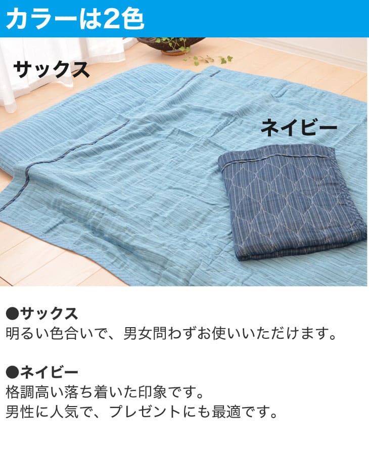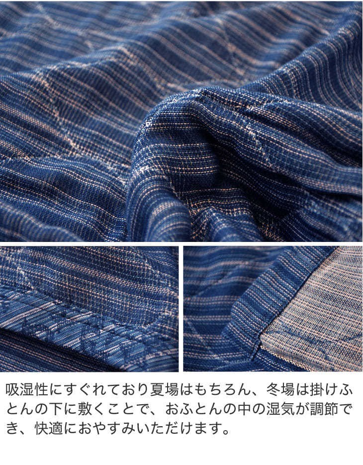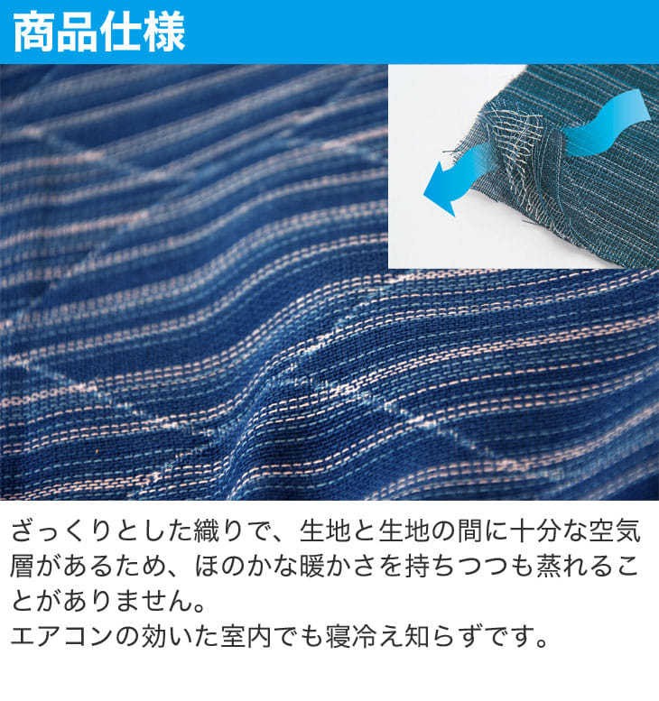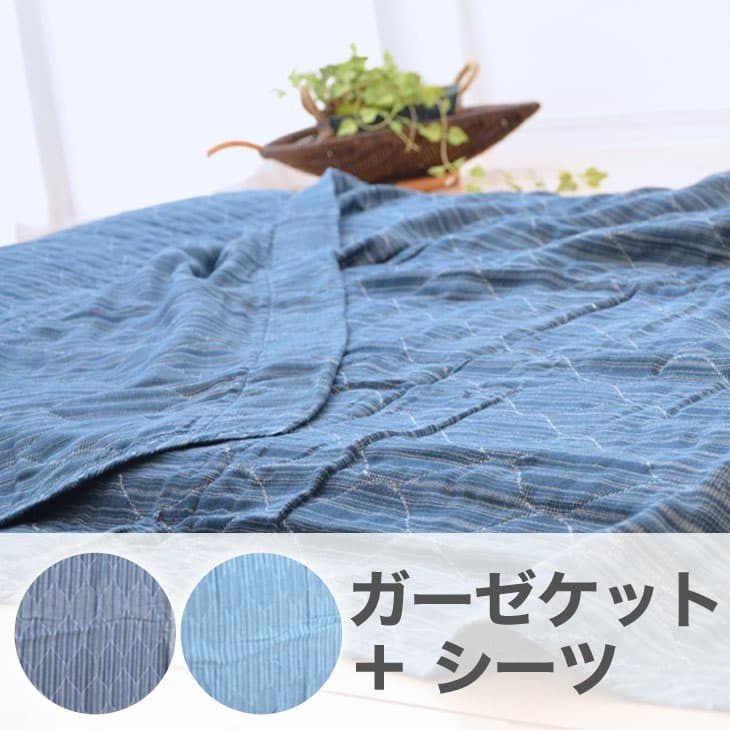 | 日本の伝統的な三河木綿を使ったガーゼケットと敷ふとん用のフラットシーツのセットです。 ざっくりとした織りの生地の間には十分な空気層があり、吸収性・放湿性に優れています。 夏の暑さや冷房対策としてはもちろん、冬の湿度調整にも役立ち、オールシーズンお使いいただけます。 フラットシーツはお布団にもマットレスにもお使いいただけます。 |