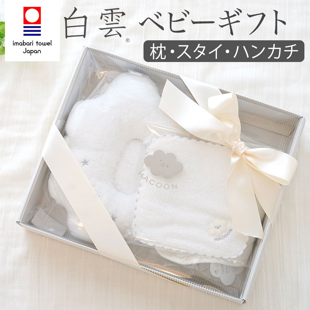 | ■白雲授乳枕(HACOON Baby Pillow) 約 27×17cm ■白雲 バンダナスタイ 約 44×20cm ■白雲 ベビーハンカチ 約 15×15cm ■ギフトボックス 約 幅27×奥行32.5×高さ7cm |