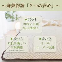 〜麻夢物語 敷きパッドの機能〜 敷きパッドとしての機能も充実。裏面は強度を保つため、アクリル生地を使用。カバーを掛けたマットレスや敷き布団の上に乗せ、ズレないように、ゴムを四隅に掛けてお使いください。 |