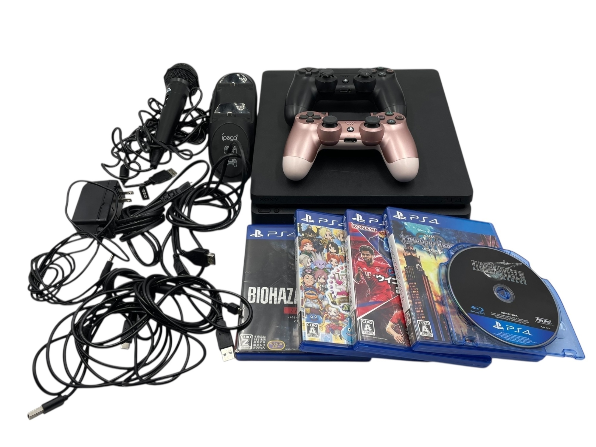 ■Sony PS4 本体 CUH-2200A 500GB 初期化済 コントローラー2台 ソフト5本 マイク スタンド 付属品多数 セット
