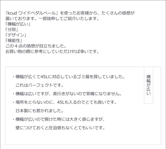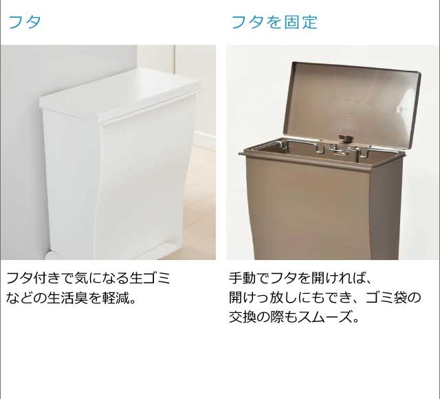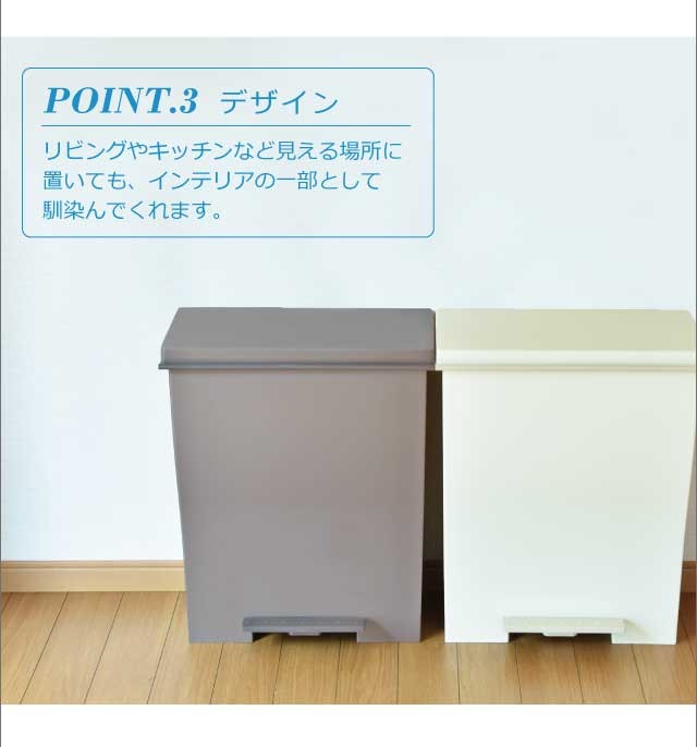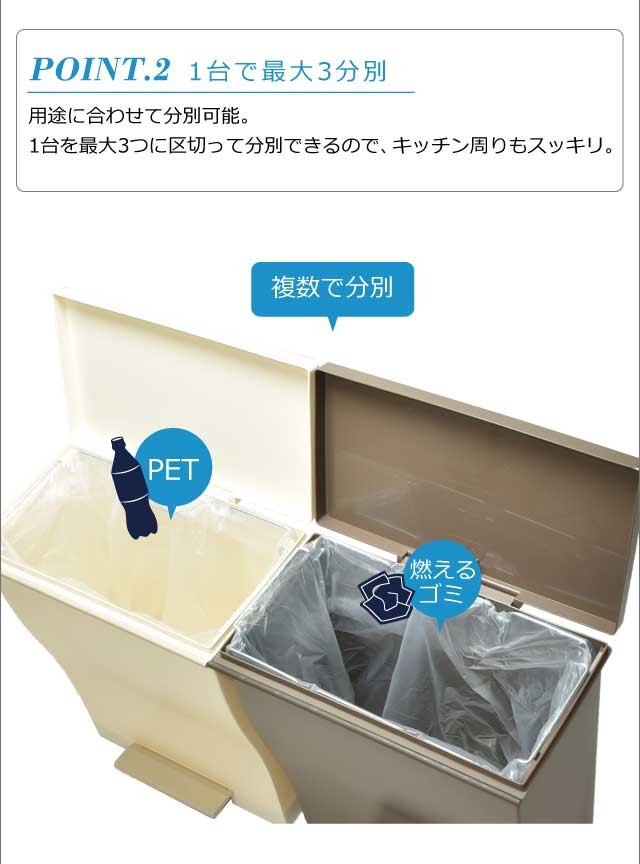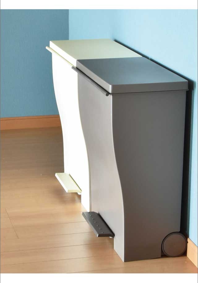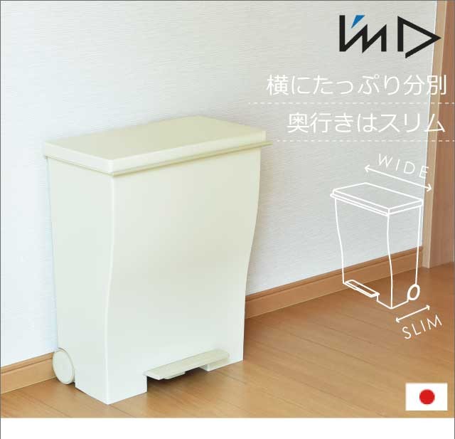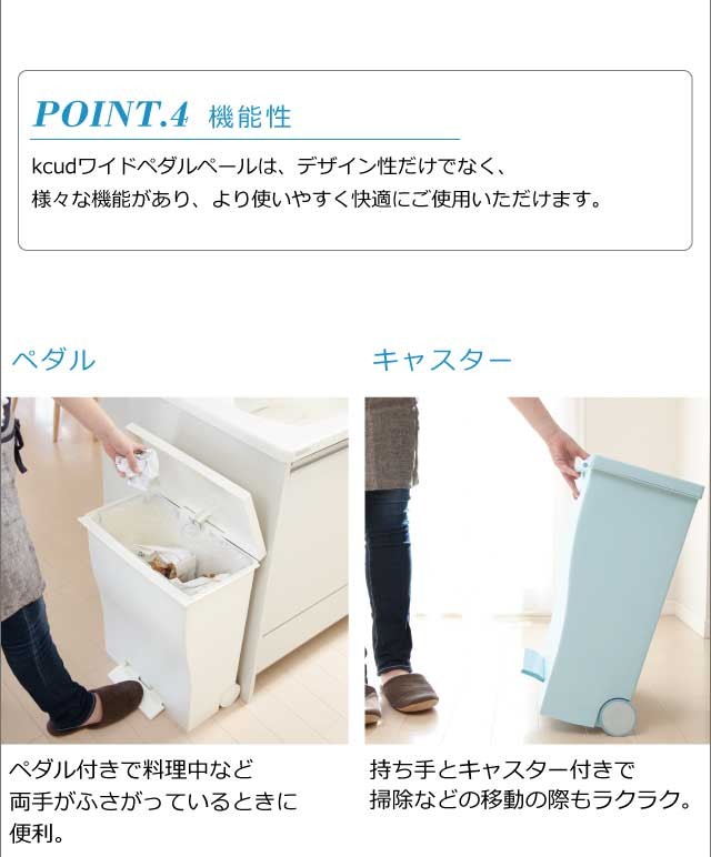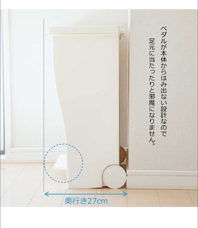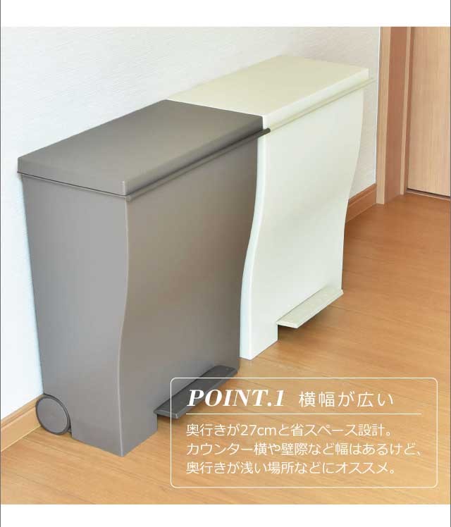 奥行きはスリムに、 横幅はグッとワイドに。人気のクードシリーズの横型『ワイドペダルペール』特徴はなんといっても、奥行き27cmと省スペース設計。カウンター横や壁際など幅あるけど、奥行きが浅い場所などにオススメです。シンプルで生活感のないスタイリッシュなデザインはインテリアの一部としてお部屋に馴染んでくれます。ペダル付きで料理中など両手がふさがっているときにも便利。手動でフタを開ければ、開けっ放しにもできるのでゴミ袋の交換の際もスムーズ。1台を最大3つに区切って分別できるので、キッチン周りもスッキリ。安心の日本製です。