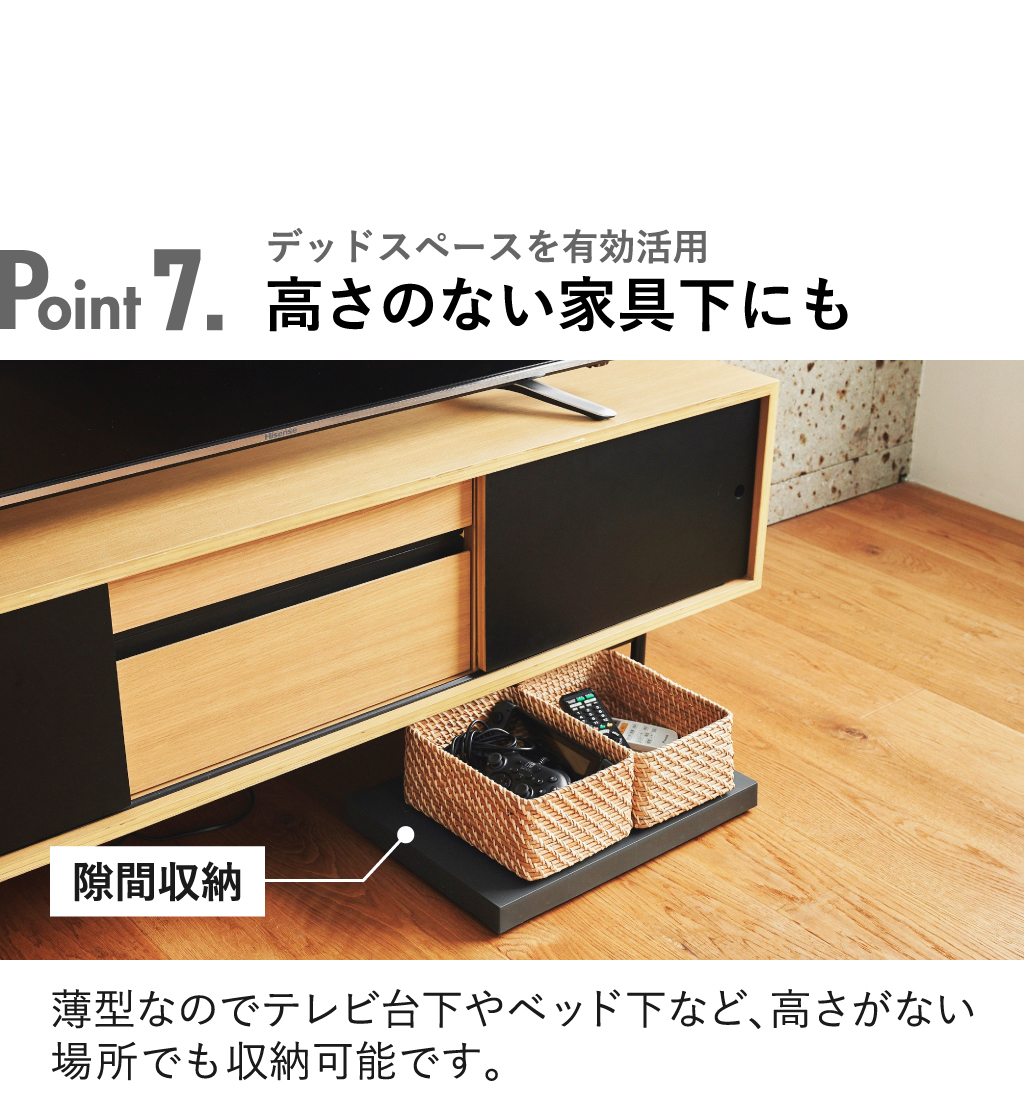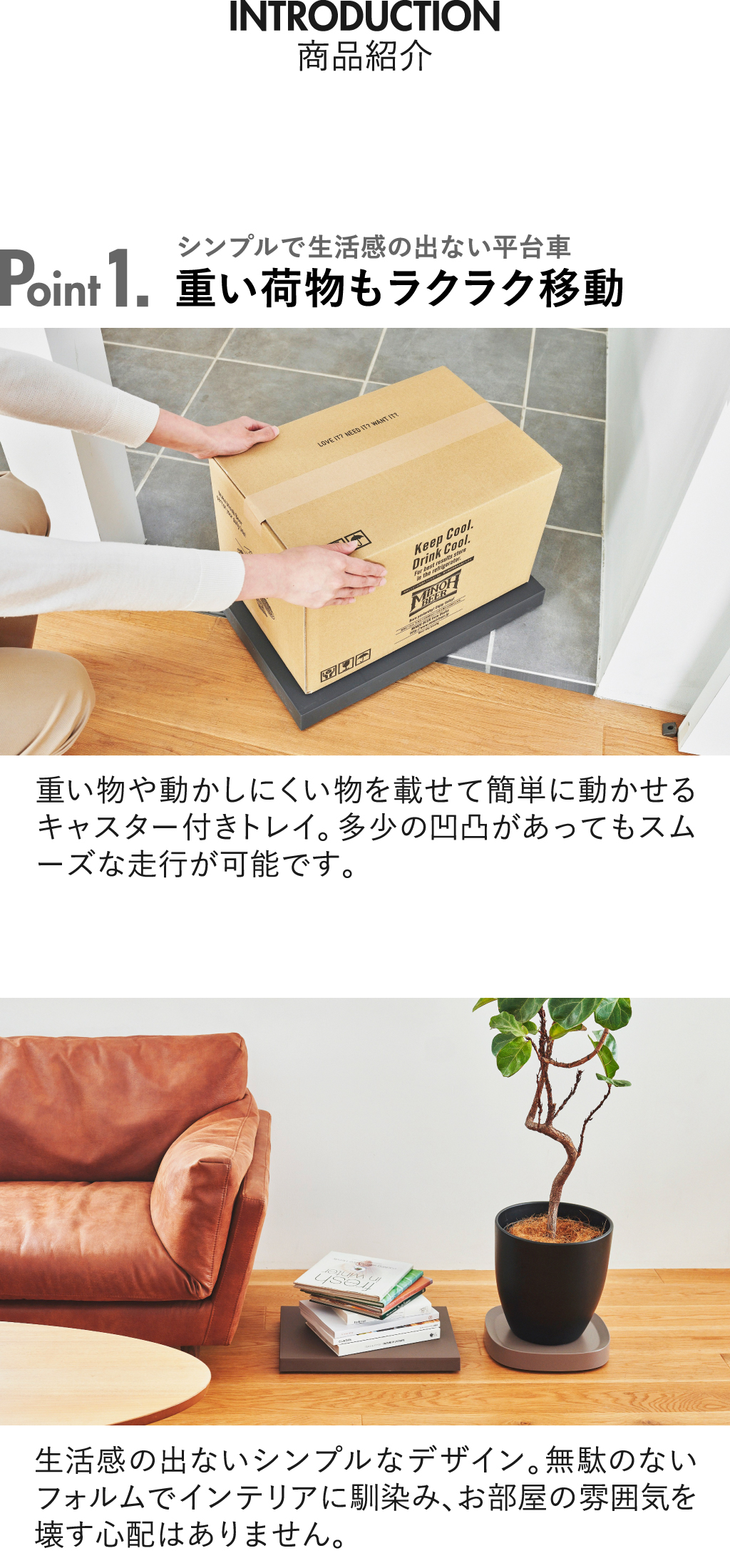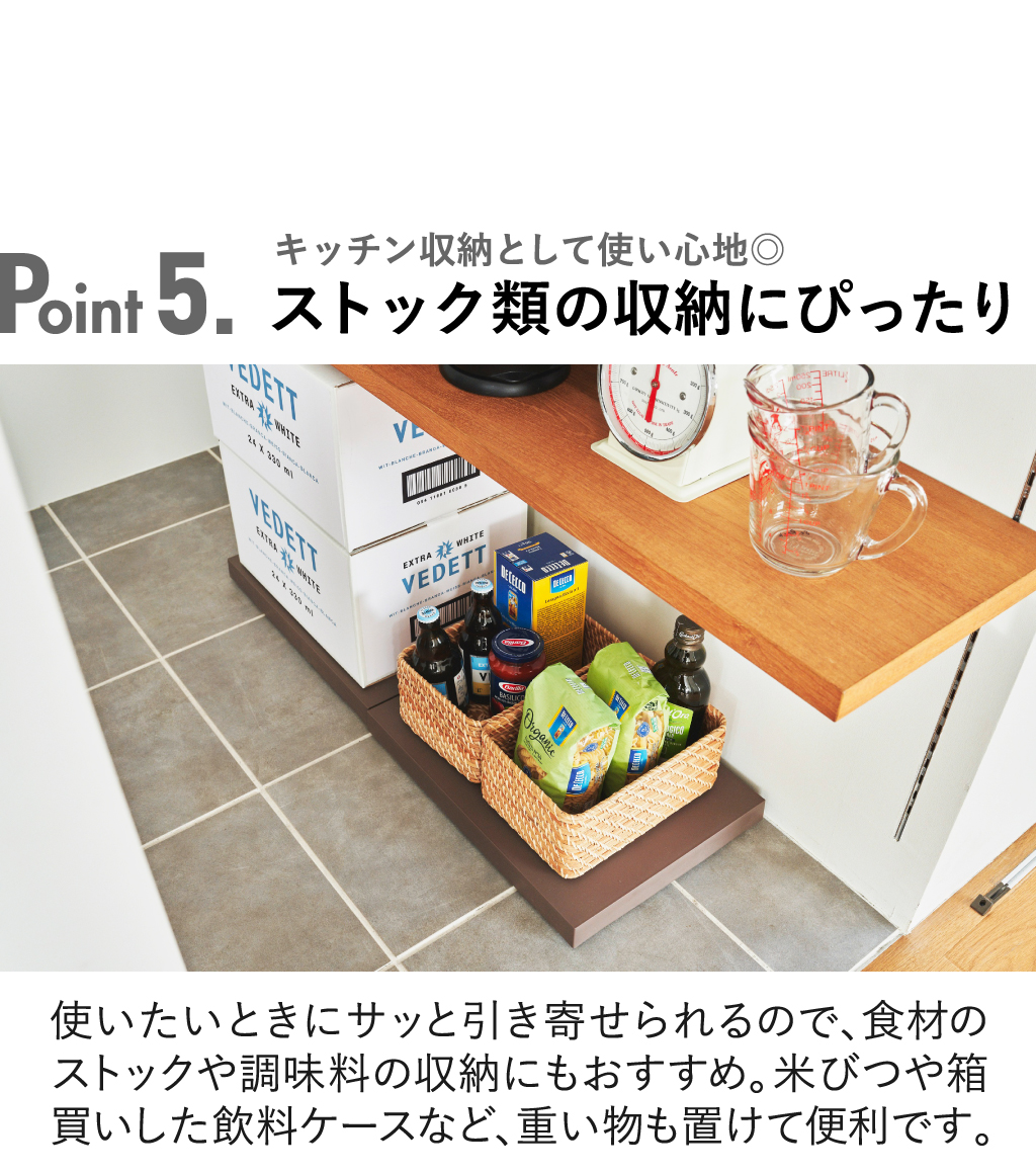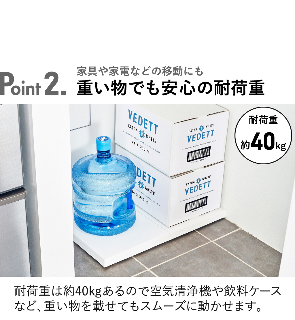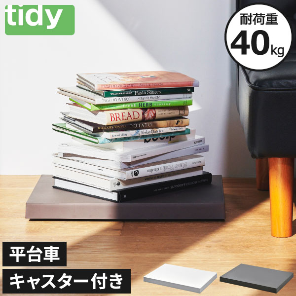 機能性とデザイン性の両方を兼ね備えた「tidy」シリーズの平台車。生活感の出ないシンプルなデザインでインテリアに馴染み、お部屋の雰囲気を守ります。重い物や動かしにくい物を載せることで簡単に移動できるキャスター付き。360度どんな方向にも滑らかに動き、多少の凹凸があってもスムーズな走行が可能な平台車です。キャスターにはラバーを貼っているので、床を傷つけにくく、静音性にも優れています。耐荷重は約40kgあるので、家電や箱買いした飲料ケースなどの重い物も乗せることができます。使いたい時にサッと引き寄せるだけで取り出せるので、キッチン収納としても◎。移動が簡単になることでお掃除も隅々までできるようになり、お部屋を清潔に保てます。直線的なデザインの平台車なので角にピッタリ収まり、複数台並べて大きい物を載せることも可能。モダンなカラーの3色でお部屋のアクセントとしても活躍してくれます。