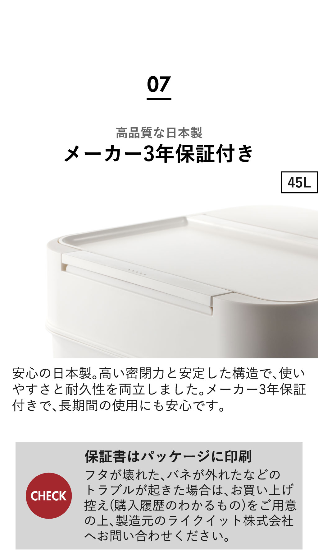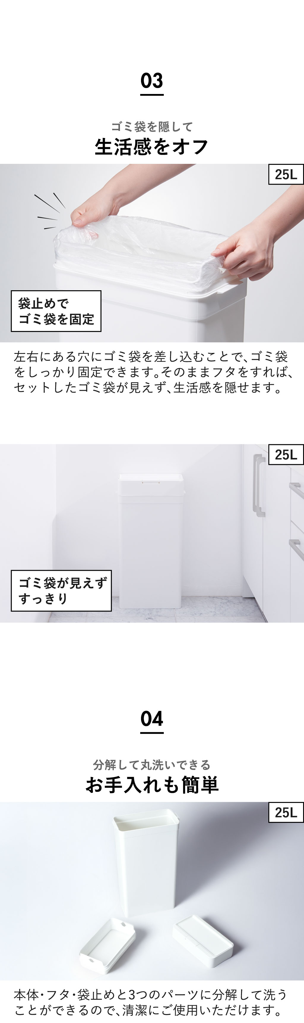 ニオイを漏らさず、快適な空間を保つ人気の密閉ゴミ箱「Seals シールズ」。フタの内側に付いたシリコンパッキンが、本体との隙間をしっかり密閉し、気になるニオイ漏れを防ぎます。生ゴミやおむつ、ペットシーツなど、ニオイの気になるゴミを捨てるのに最適です。フタはワンプッシュで簡単に開き、片手がふさがっていても指一本でラクに操作できます。開口部も広く、大きめのゴミもスムーズに捨てられて便利。フタを開けても壁に当たらない設計なので、壁際にぴったり設置できます。袋止めでゴミ袋をしっかり固定でき、フタをすればゴミ袋が見えないので生活感を隠せます。本体は分解して丸洗いできるため、お手入れも簡単です。シンプルでおしゃれなゴミ箱なので、キッチンやリビングなどどんな空間にも自然に馴染みます。ゴミ箱の容量は、用途や設置場所に合わせて「9.5L」「25L」「45L」の3サイズをご用意。コンパクトな「9.5L」は、トイレでサニタリーボックスやトイレポットとしても活躍します。スリムな「25L」は、ちょっとした隙間に置けるので、キッチンで分別用に並べて使用するのもおすすめ。大容量の「45L」はゴミをたっぷり捨てたい方にぴったり。1台で2分別も可能です。また、「9.5L」「25L」のブラックのみ、抗ウイルス・抗菌タイプも選べます。高品質な日本製で、メーカー3年保証付き。長く安心してお使いいただけます。