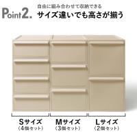 インテリアに馴染む無駄のないシンプルなデザインの収納ボックス。マットな質感で中が透けないので、見られたくない物や生活感がでるものを隠して収納できます。4個組のSサイズ、3個組のMサイズ、2個組のLサイズの3サイズ展開。それぞれセットで並べて使っても高さは同じなので、スッキリ収納できます。また、異なるサイズ同士でもスタッキングでき、高さも揃うので、収納する物や使う場所に応じて自分好みの収納空間を作り出すことができます。奥行き約50cmとクローゼットに程よく収まるサイズ感。お部屋に置く際も圧迫感なく設置できる収納ボックスです。本体背面部には積み重ねた際の転倒防止としてロック機能が付属。最後まで引き出しても抜け下りないストッパー機能も付いているので安全性抜群です。本体の変形を防ぐため、枠に頑丈な素材を使用。スタッキングしたり天板に物を置いてもたわむ心配はありません。高級感漂うオールホワイト・オールグレー・ベージュの3色からお選びください。
