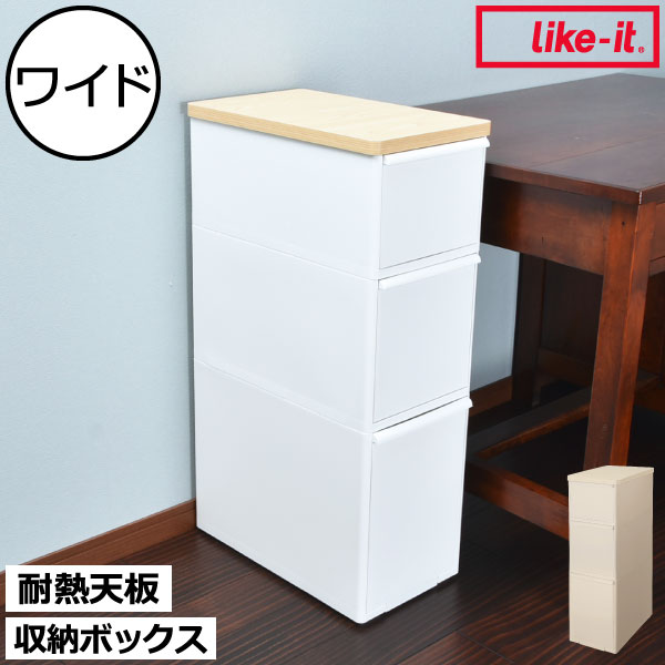キッチンのデッドスペースを有効活用できる収納ボックス。マットな質感のシンプルなデザインがインテリアに溶け込み、ナチュラルな雰囲気を演出します。幅がそれぞれ違う「スリム」と「ワイド」の2サイズ展開。自分のキッチンスペースや雰囲気に合うサイズをお選び頂けます。木製の天板はメラミン加工を施しており、耐熱150℃の丈夫な作り。調理補助台にもなり、熱いやかんや鍋などの一時置きとしても活躍します。横幅スリムにも関わらず、3段収納でたっぷり入る収納ボックス。優れた耐荷重により、小物から大きめの調理器具までスッキリ収納できます。引き出しは最後まで引っ張っても抜け落ちないストッパー機能付き。取っ手は指にかけやすい形状になっており、大きくかがむ執拗もありません。後方にはキャスターが付いているので、お掃除の際も移動がラクラク。お手入れは拭き掃除をサッとするだけで清潔を保つことができます。カラーはオールホワイトとベージュの2色からお選びください。