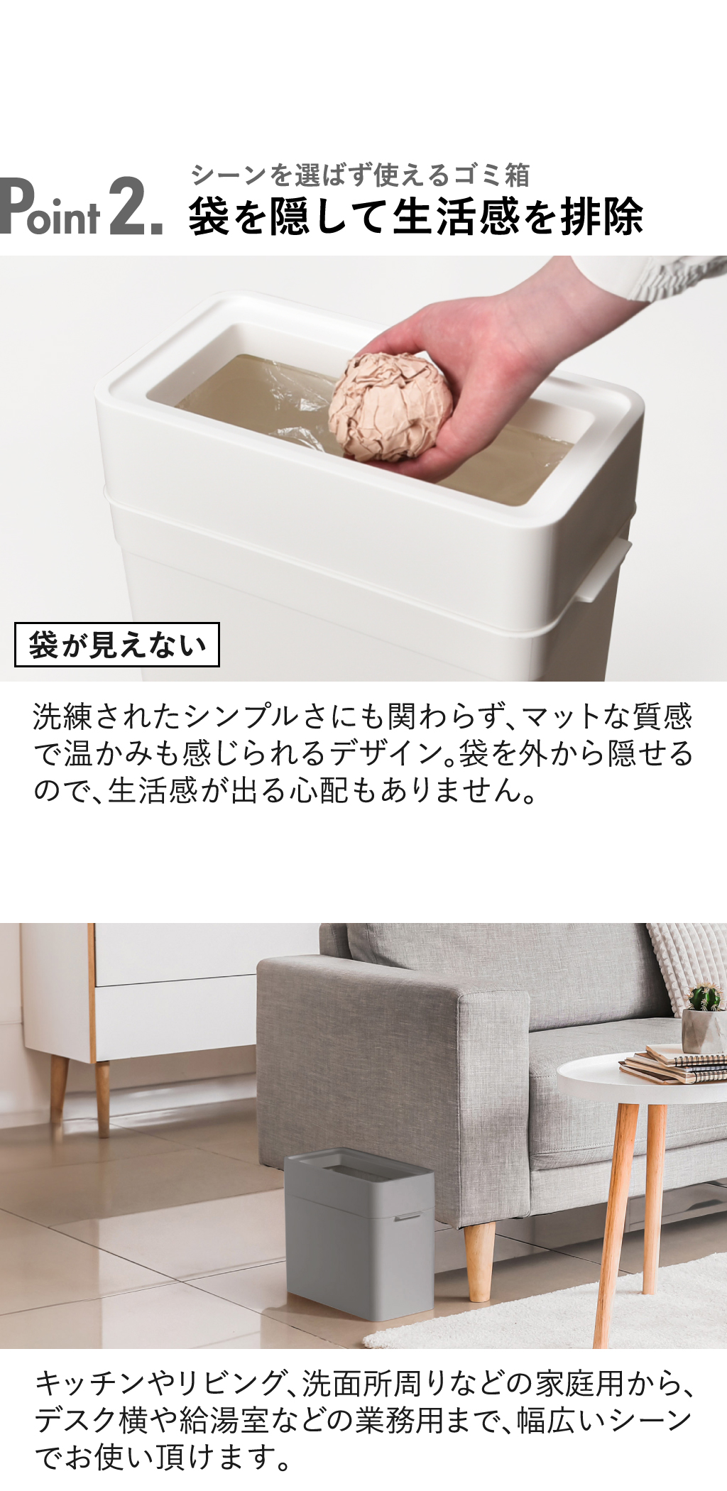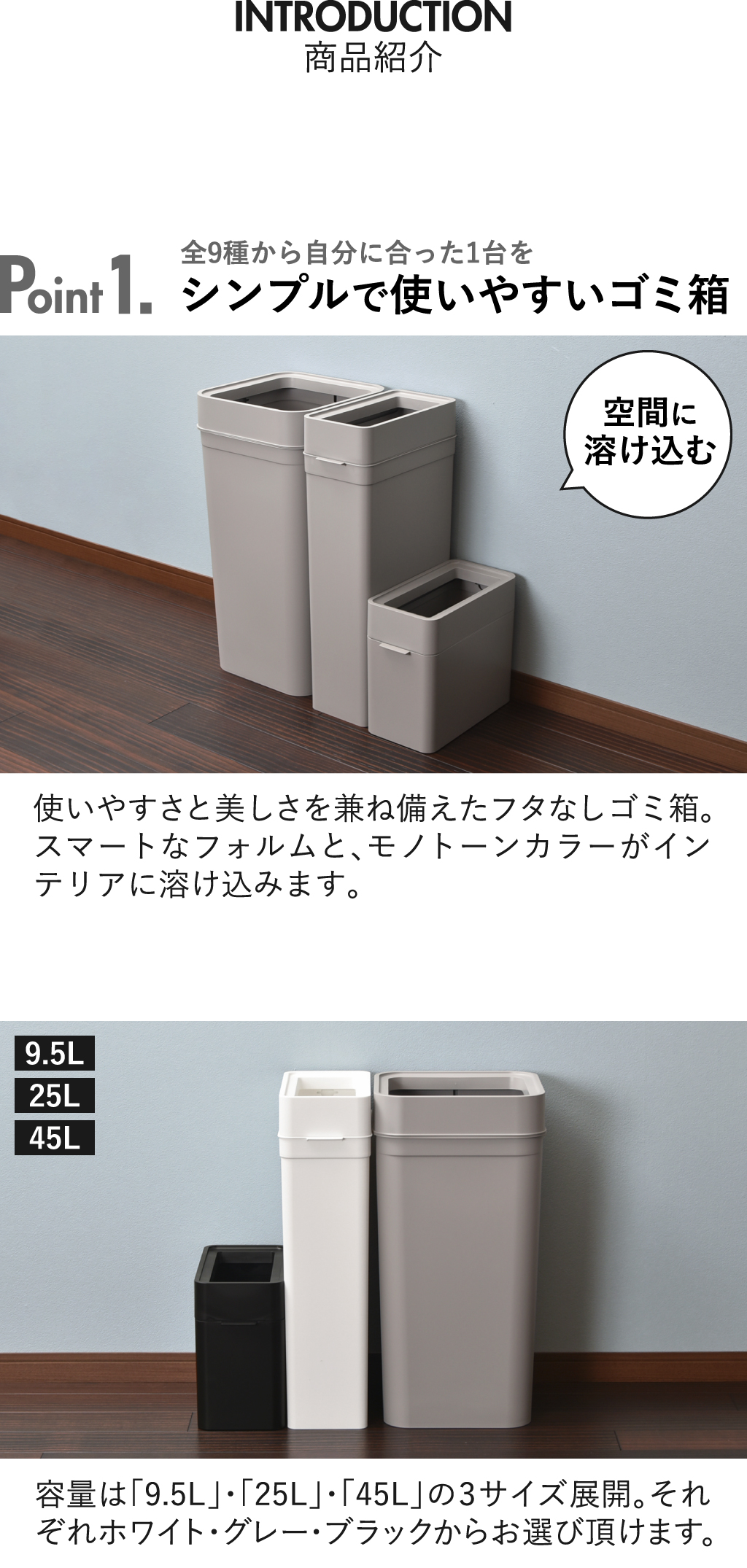 使いやすさと美しさを兼ね備えたフタなしゴミ箱「マルチパーパスビン」。スマートなフォルムと、モノトーンカラーがインテリアに溶け込みます。洗練されたシンプルさにも関わらず、マットな質感で温かみも感じられるゴミ箱。袋を外から隠せるので、生活感が出る心配もありません。コンパクトサイズの「9.5L」はシンク上などのちょっとしたゴミ箱に最適。奥行きスリムな「25L」はキッチンの隙間などに設置することができます。「45L」は一台で2分別でき、たっぷりゴミ捨てできます。袋止めのクリップホールに袋を差し込むだけでしっかり袋を固定。掃除の際も取っ手・くぼみが付いているため簡単に移動可能です。ホワイト・グレー・ブラックから自分好みの一台をお選び下さい。