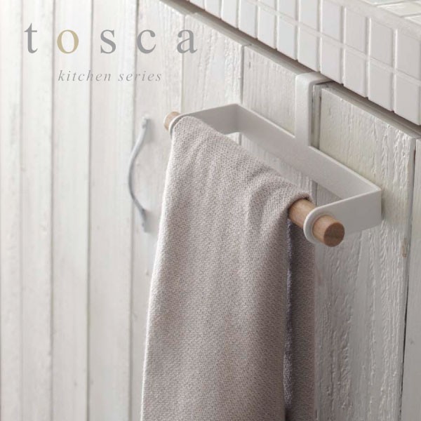 山崎実業のナチュラルテイストなシリーズ「tosca」のキッチンタオルハンガーです。スチールと木の組合せが美しい「toscaシリーズ」は、北欧テイストのぬくもりがあり自宅にいながらカフェにいるような雰囲気を味わえます。白く塗装したスチールと木製のバーを組み合わせたキッチンタオルハンガーです。シンクの扉に差し込むだけの簡単取り付けで、キッチンタオルや付近などをコンパクトに収納出来ます。フック部分に3カ所と背面に2カ所滑り止めが付いており、扉に傷をつける心配もありません。天然木のバーはシリコンのストッパーで固定されているので安心です。またバーは取り外す事が出来るのでお掃除もラクラクです。ポイント利用。