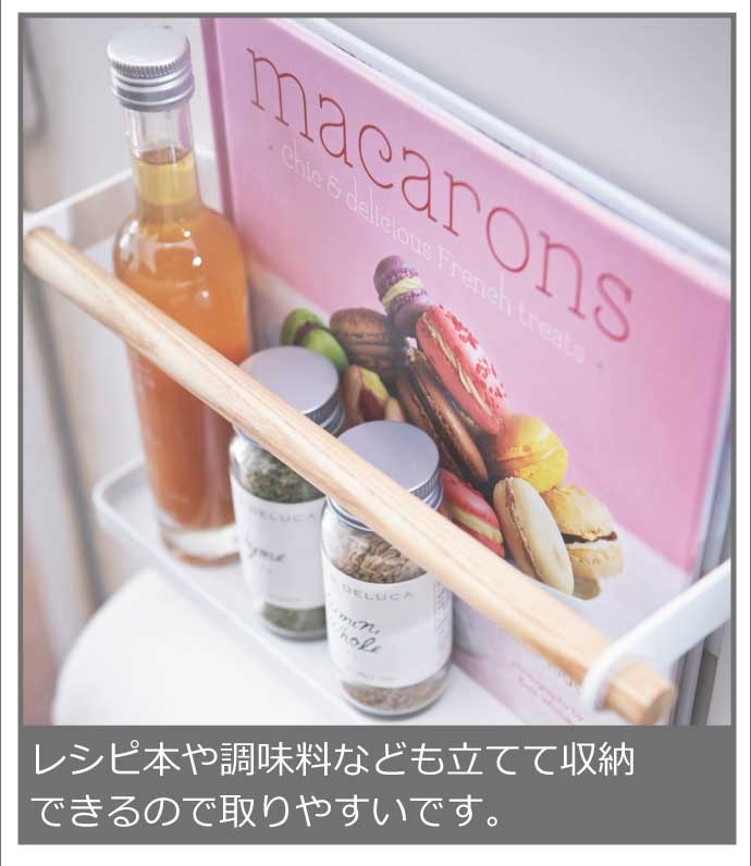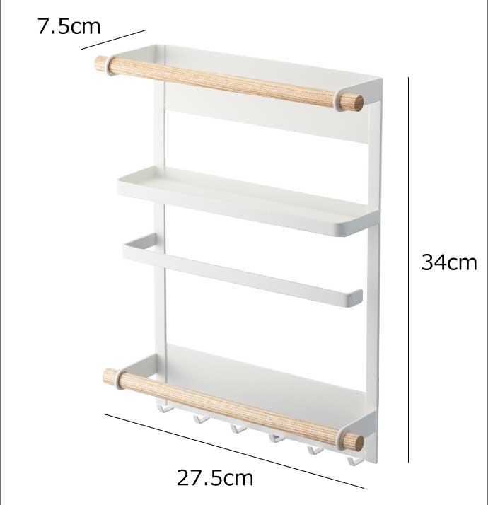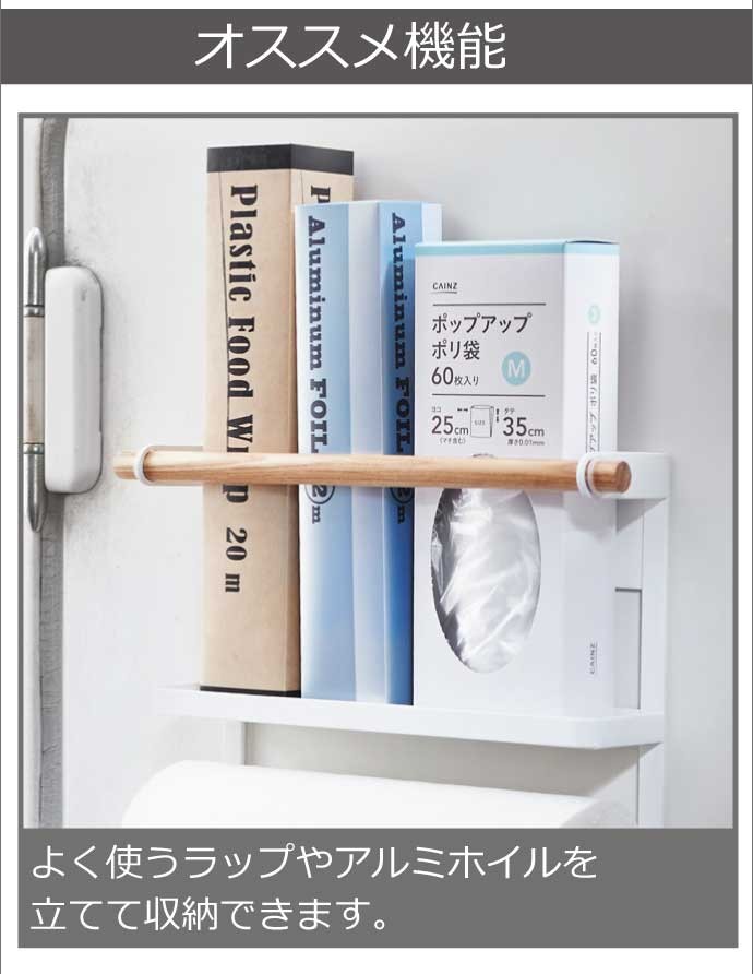 冷蔵庫側面などスチール壁面を利用して、良く使うキッチン小物を一括収納できます。