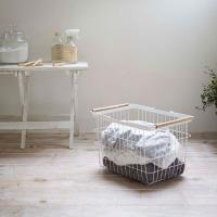 日々の洗濯を楽にしてくれる、toscaシリーズのランドリーバスケットMサイズです。ホワイトのフレームに天然木のハンドルの組み合わせが、おしゃれな空間を演出。置く場所を選ばないスリムなフォルムで、ちょっとした隙間を活かして設置できます。2個並べて使えば、色落ちする衣類と通常の洗濯物を、あらかじめ仕分けできて便利です。たっぷり入れることができる、約23Lの大容量タイプで、タオル類の収納としても活躍。風通しが良く湿気がこもりにくいワイヤータイプだから、気になるカビの発生を防いでくれます。ハンドル部分は、持ちやすい可動式で、片手でも簡単に持ち運ぶことができます。水に濡れて冷たくなった洗濯物も、直接触れることなく移動できるから、冬場も安心。耐久性に優れたスチール製で、簡単にお手入れできるのも嬉しいポイントです。