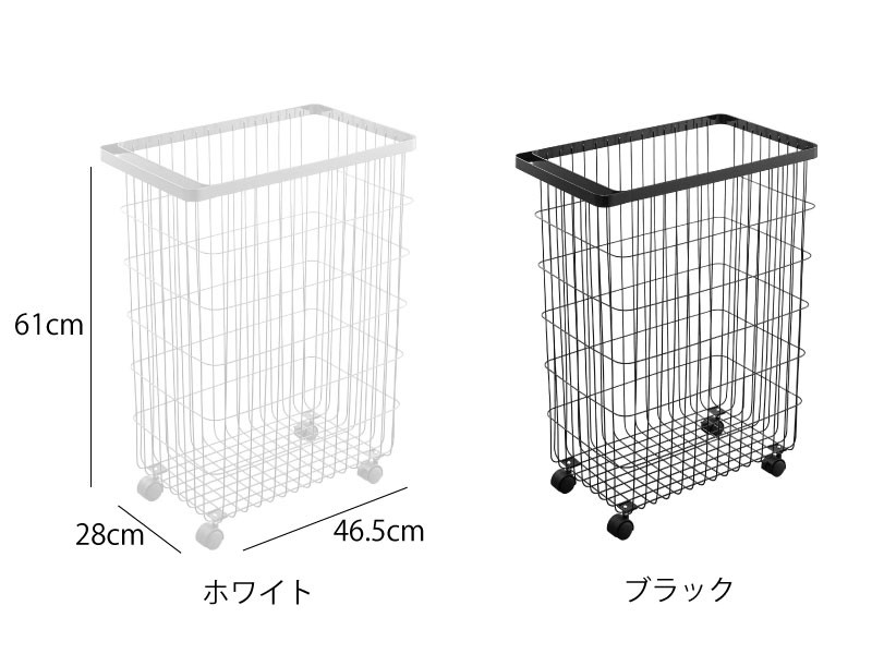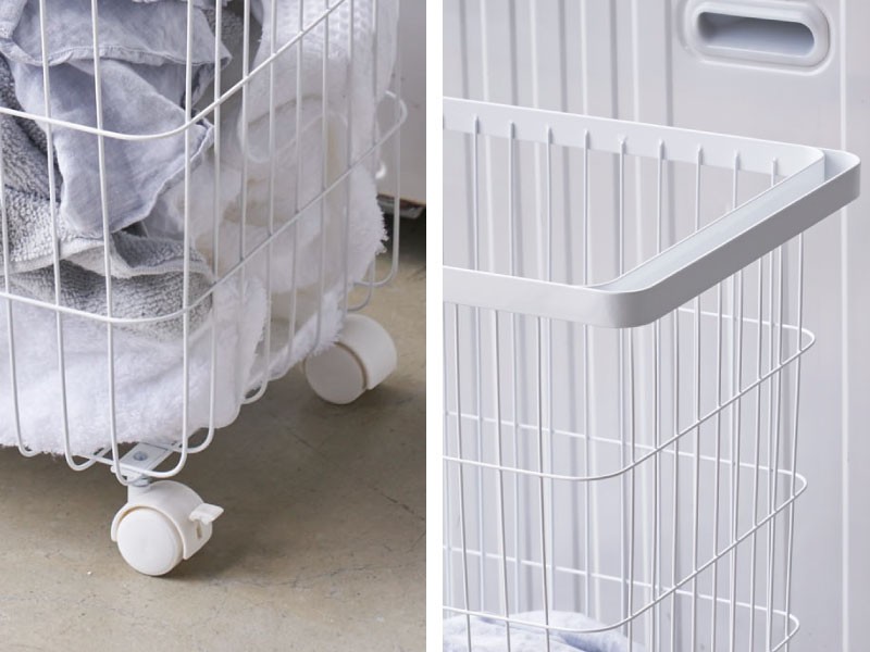 狭いスペースでも活躍できるキャスター付きのランドリーバスケットです。見た目以上に、55Lと大容量、洗濯物の回収に大活躍してくれます。キズやサビがつきにくい粉体塗装を施しているので、水まわりでも長く使用していただけます。通気性がよく、湿気や嫌なにおいがこもりにくいワイヤー型のバスケットなので、清潔に使用できるのも魅力です。またハンドルとキャスターがついているので、干場への移動の際にも楽に動かすことができます。