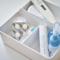絆創膏や消毒液、爪切りなどの衛生用品から体温計や常備薬まで、1か所に収納することができます。身の回りでよく使うものを、ひとまとめて置くことができて便利です。上段には小分けにした錠剤や目薬などの小物の収納に便利なトレー付き。