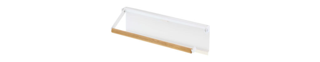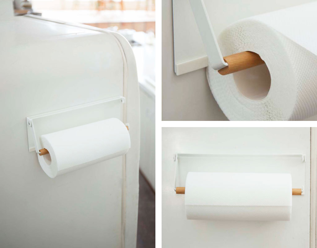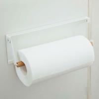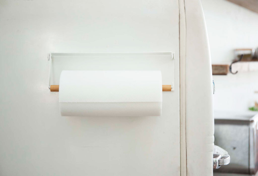 冷蔵庫やスチールパネルに貼り付けられる、マグネット付きキッチンペーパーホルダーです。温かみのある天然木のバーがアクセントの、インテリアに馴染みやすいシンプルでおしゃれなデザイン。シリコーン製のストッパーがホールドしてくれるから、手前に引くだけで片手でさっと取れて便利です。約幅30.5cmとワイドだから、海外製の大判タイプのキッチンペーパーロールにも対応可能。しっかりと固定できる強力なマグネットが付いており、ズレたり落ちたりする心配がありません。サビや汚れに強いスチール製。汚れたらさっと拭き取れるから、お手入れも簡単です。ロールを横からスッと入れるだけで簡単にセットできるから、取り替えもスムーズ。バーの先端についた返しが、使っている時にロールが落ちるのを防いでくれます。